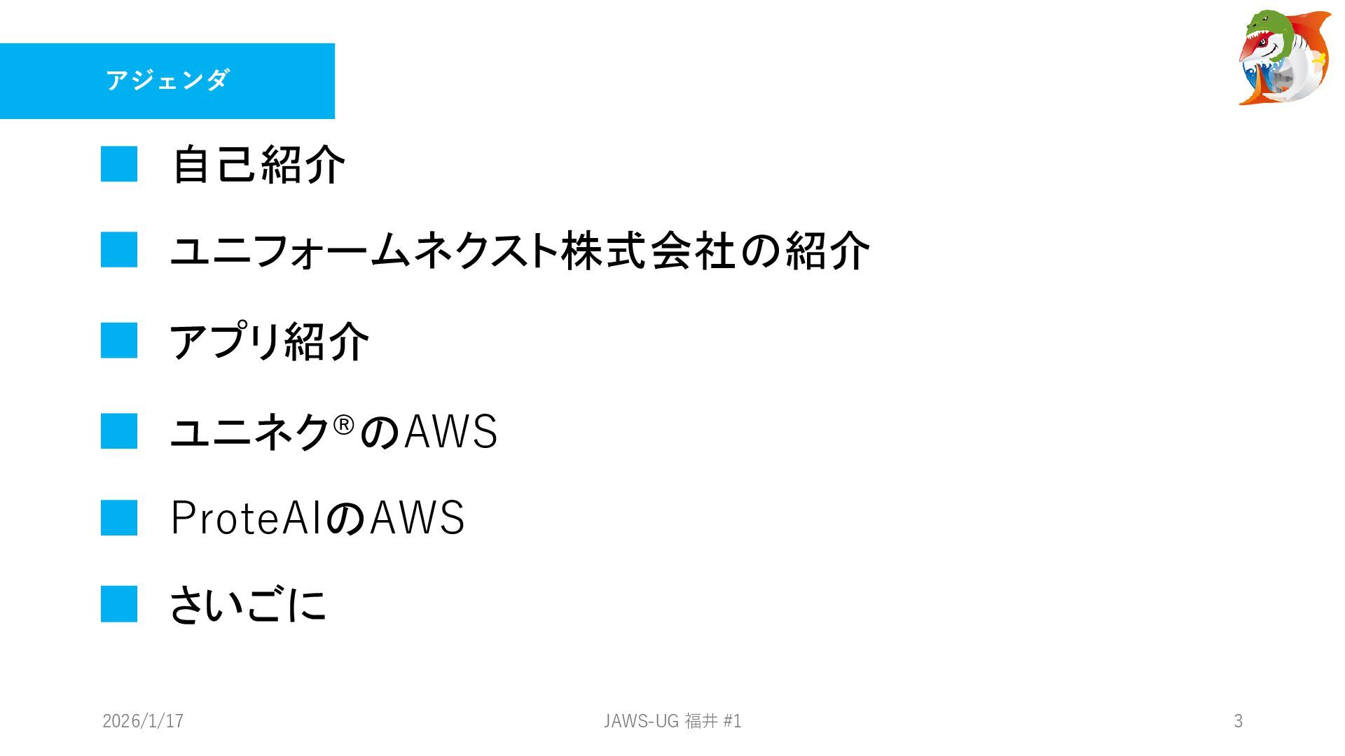 3 JAWS-UG 福井 #1 アジェンダ 2026/1/17 自己紹介 ユニフォームネクスト株式会社の紹介 アプリ紹介 ユニネク®︎のAWS
