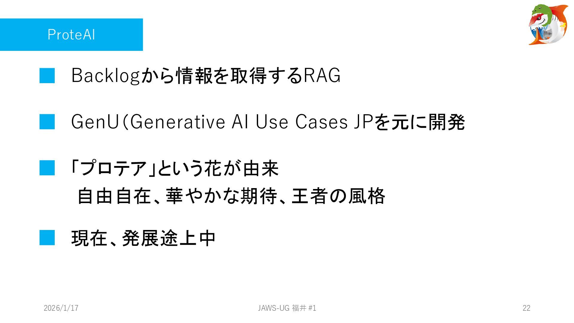 2026/1/17 JAWS-UG 福井 #1 22 ProteAI Backlogから情報を取得するRAG GenU(Generative AI Use