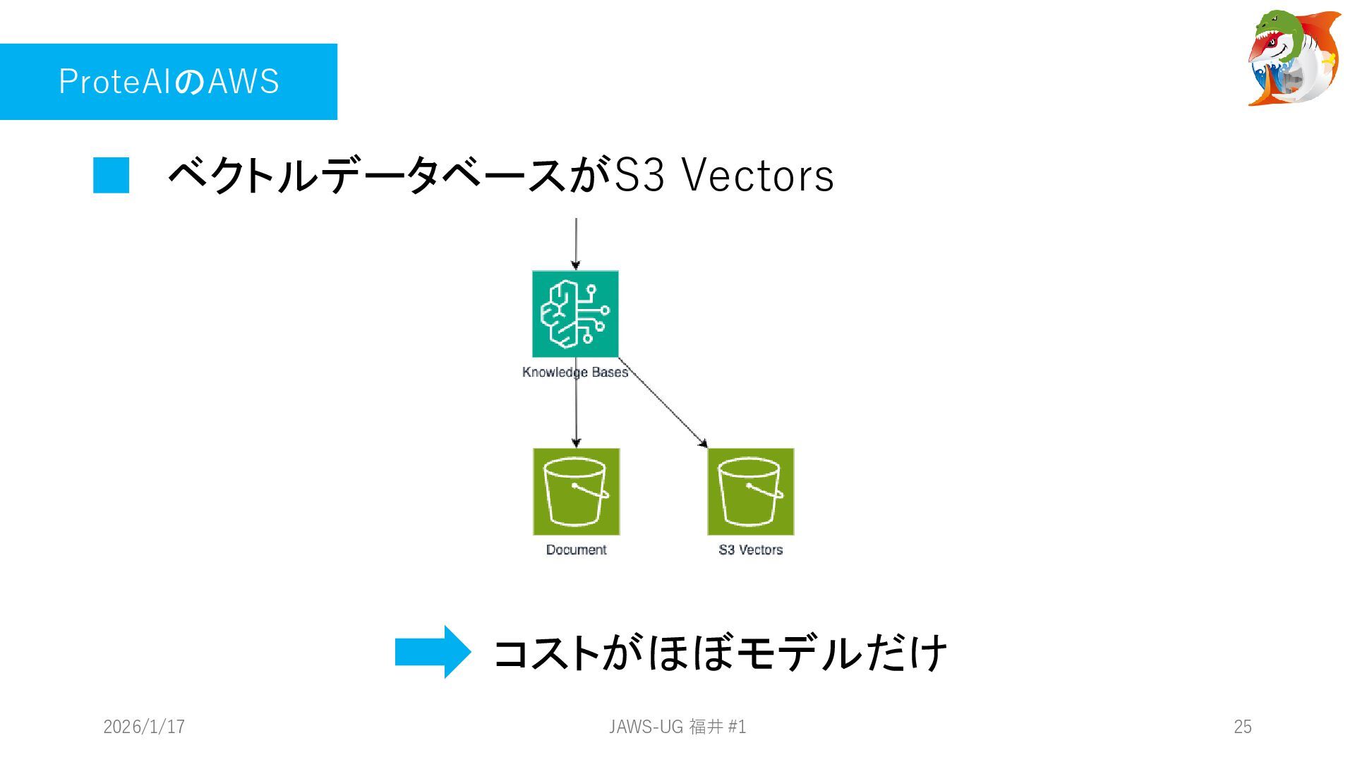 2026/1/17 JAWS-UG 福井 #1 25 ProteAIのAWS ベクトルデータベースがS3 Vectors コストがほぼモデルだけ