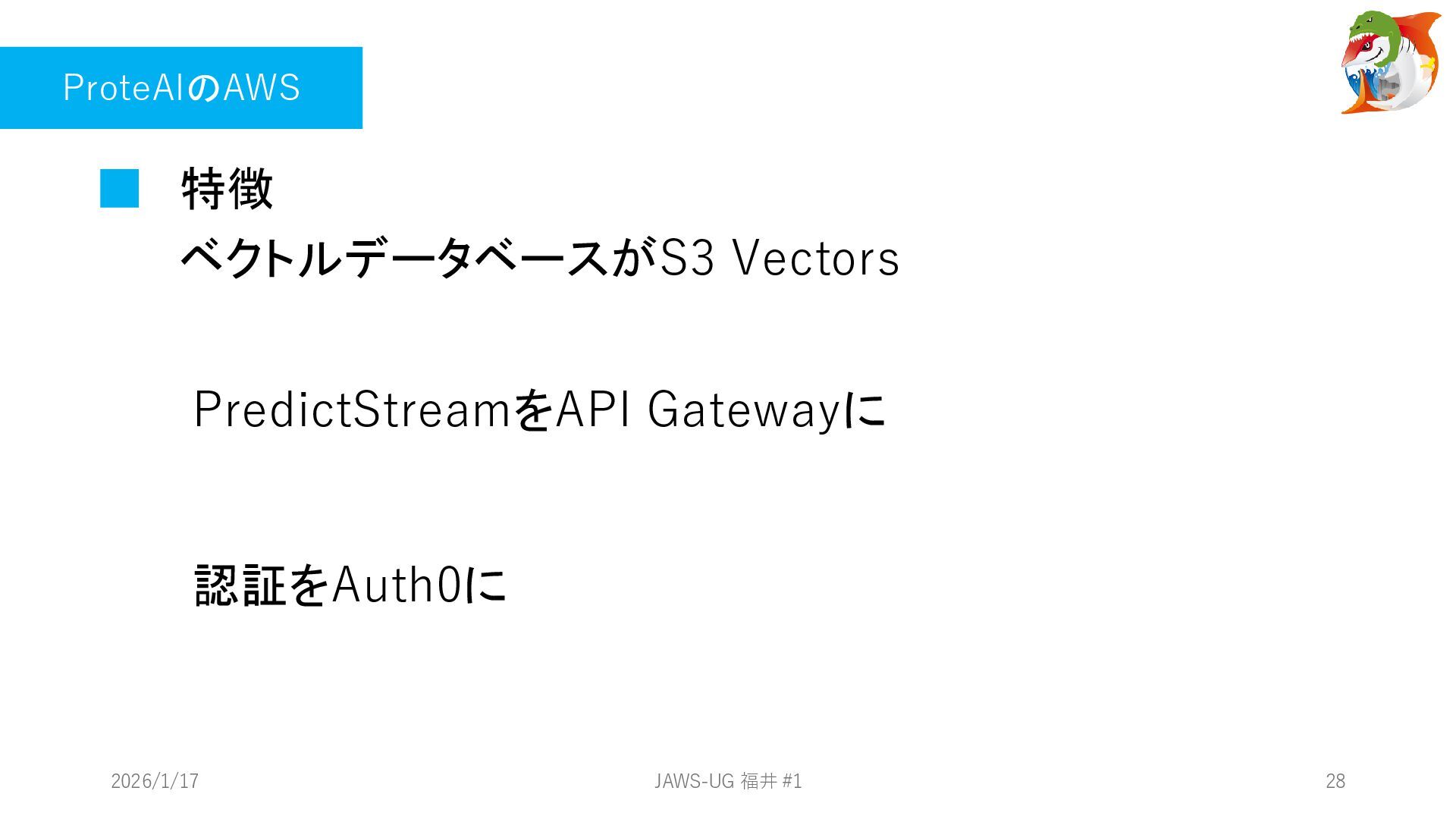 2026/1/17 JAWS-UG 福井 #1 28 ProteAIのAWS 特徴 ベクトルデータベースがS3 Vectors PredictStreamをAPI