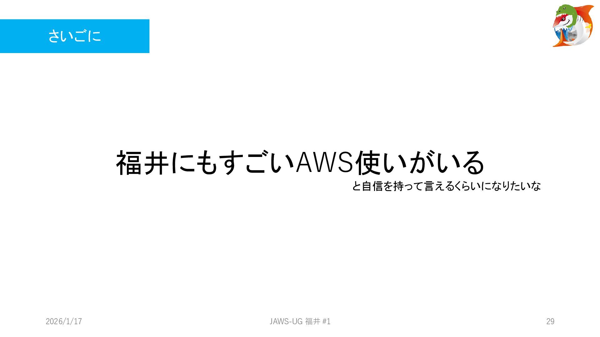 2026/1/17 JAWS-UG 福井 #1 29 さいごに 福井にもすごいAWS使いがいる と自信を持って言えるくらいになりたいな