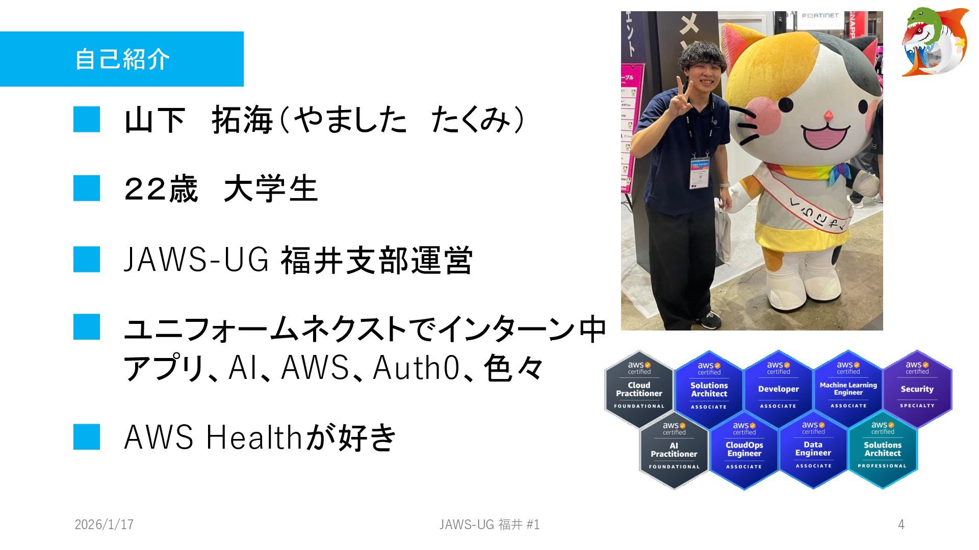 2026/1/17 JAWS-UG 福井 #1 4 山下 拓海(やました たくみ) 22歳 大学生