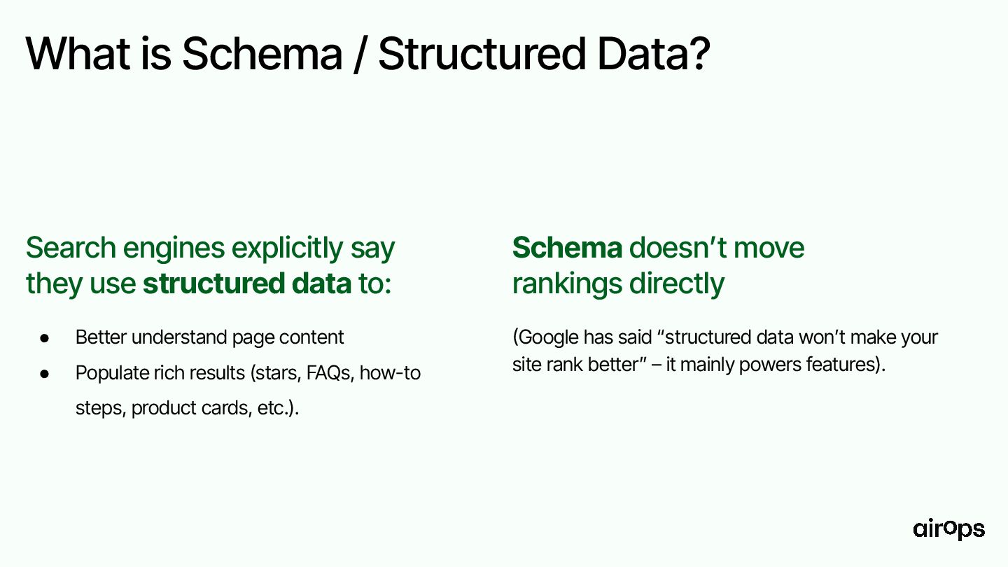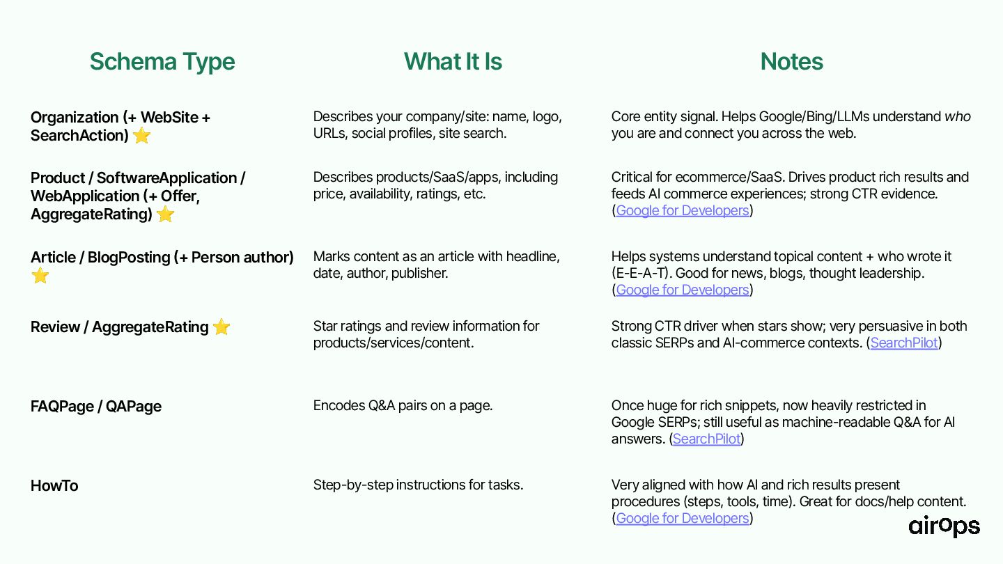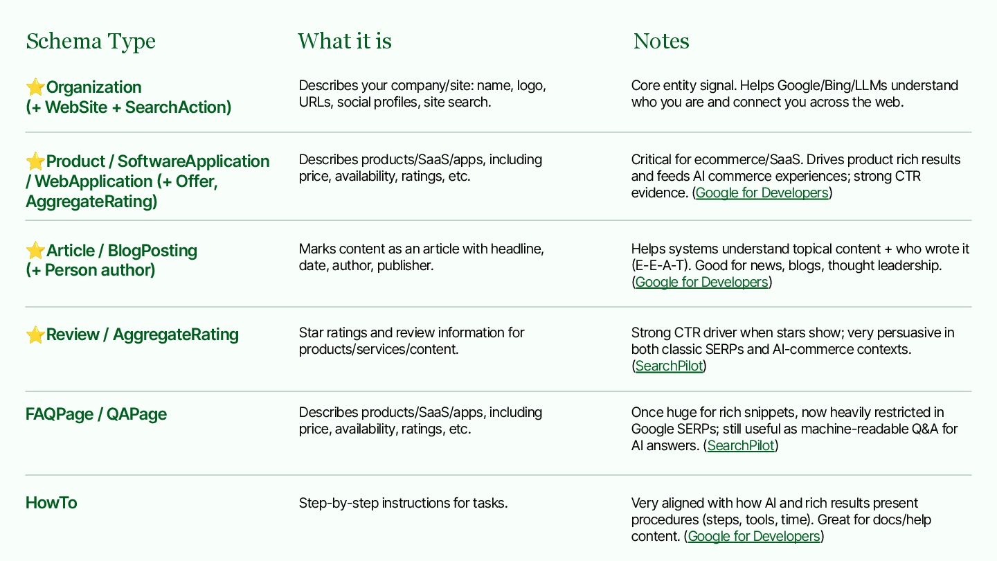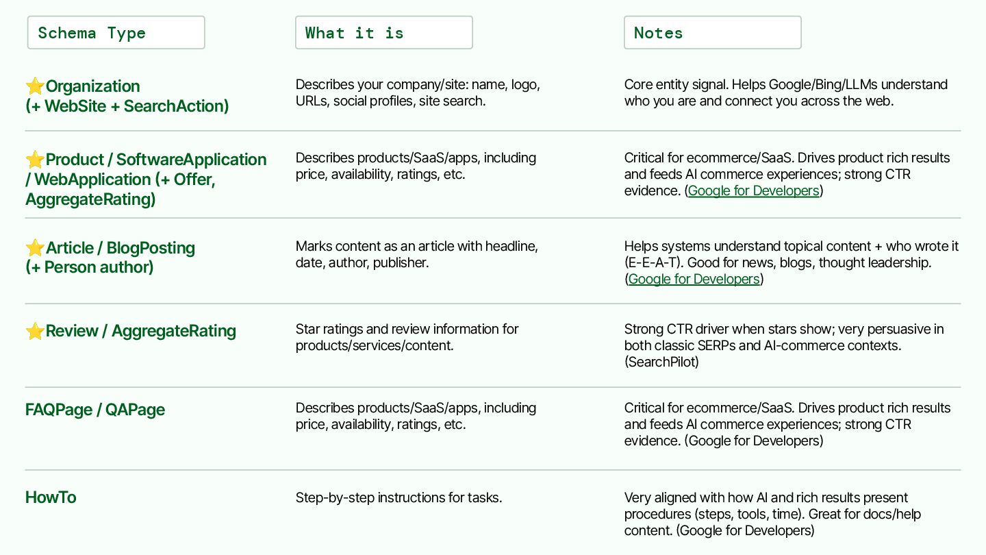 (+ Offer, AggregateRating) Describes your company/site: name, logo, URLs, social profiles, site search. Core entity signal. Helps Google/Bing/LLMs understand who you are and connect you across the web. ⭐Article / BlogPosting (+ Person author) FAQPage / QAPage HowTo Describes products/SaaS/apps, including price, availability, ratings, etc. Critical for ecommerce/SaaS. Drives product rich results and feeds AI commerce experiences; strong CTR evidence. (Google for Developers) Marks content as an article with headline, date, author, publisher. Helps systems understand topical content + who wrote it (E-E-A-T). Good for news, blogs, thought leadership. (Google for Developers) Describes products/SaaS/apps, including price, availability, ratings, etc. Once huge for rich snippets, now heavily restricted in Google SERPs; still useful as machine-readable Q&A for AI answers. (SearchPilot) Step-by-step instructions for tasks. Very aligned with how AI and rich results present procedures (steps, tools, time). Great for docs/help content. (Google for Developers) ⭐Review / AggregateRating Star ratings and review information for products/services/content. Strong CTR driver when stars show; very persuasive in both classic SERPs and AI-commerce contexts. (SearchPilot) Schema Type What it is Notes
