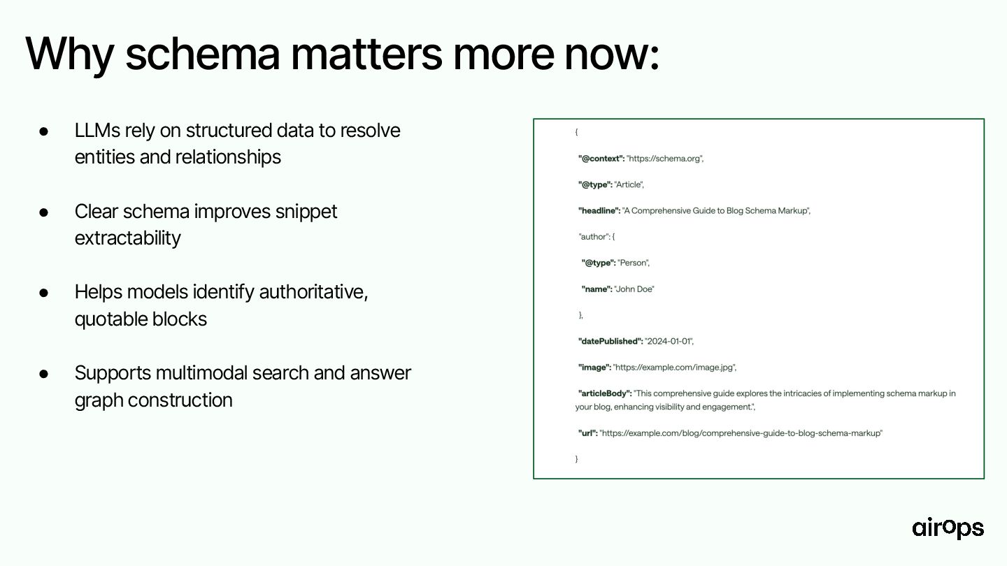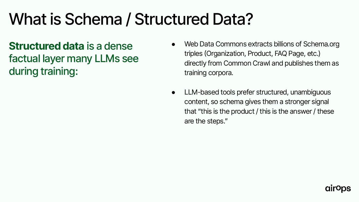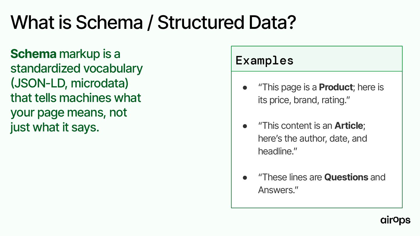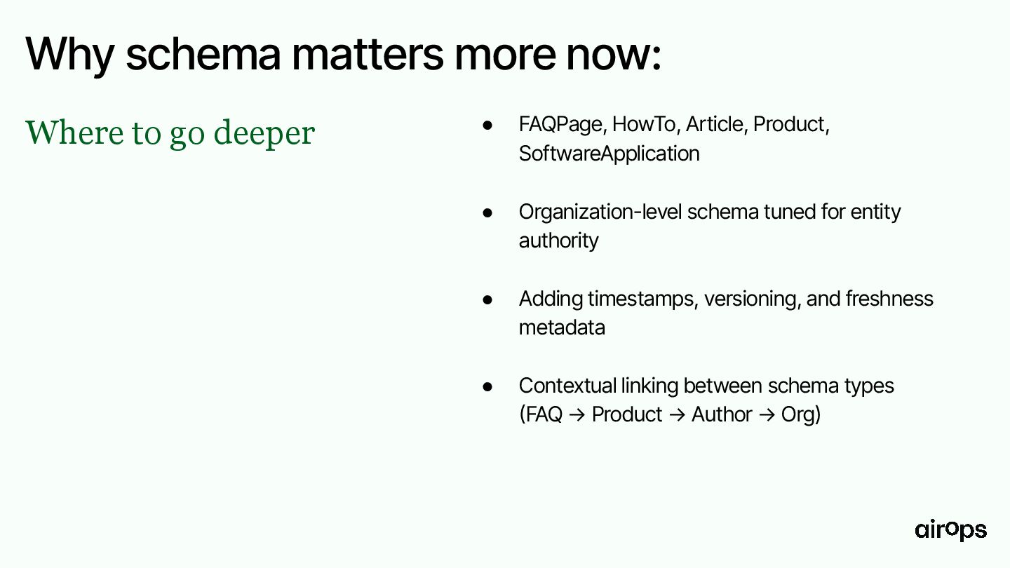 (+ Offer, AggregateRating) Describes your company/site: name, logo, URLs, social profiles, site search. Core entity signal. Helps Google/Bing/LLMs understand who you are and connect you across the web. ⭐Article / BlogPosting (+ Person author) FAQPage / QAPage HowTo Describes products/SaaS/apps, including price, availability, ratings, etc. Critical for ecommerce/SaaS. Drives product rich results and feeds AI commerce experiences; strong CTR evidence. (Google for Developers) Marks content as an article with headline, date, author, publisher. Helps systems understand topical content + who wrote it (E-E-A-T). Good for news, blogs, thought leadership. (Google for Developers) Describes products/SaaS/apps, including price, availability, ratings, etc. Once huge for rich snippets, now heavily restricted in Google SERPs; still useful as machine-readable Q&A for AI answers. (SearchPilot) Step-by-step instructions for tasks. Very aligned with how AI and rich results present procedures (steps, tools, time). Great for docs/help content. (Google for Developers) ⭐Review / AggregateRating Star ratings and review information for products/services/content. Strong CTR driver when stars show; very persuasive in both classic SERPs and AI-commerce contexts. (SearchPilot) Schema Type What it is Notes