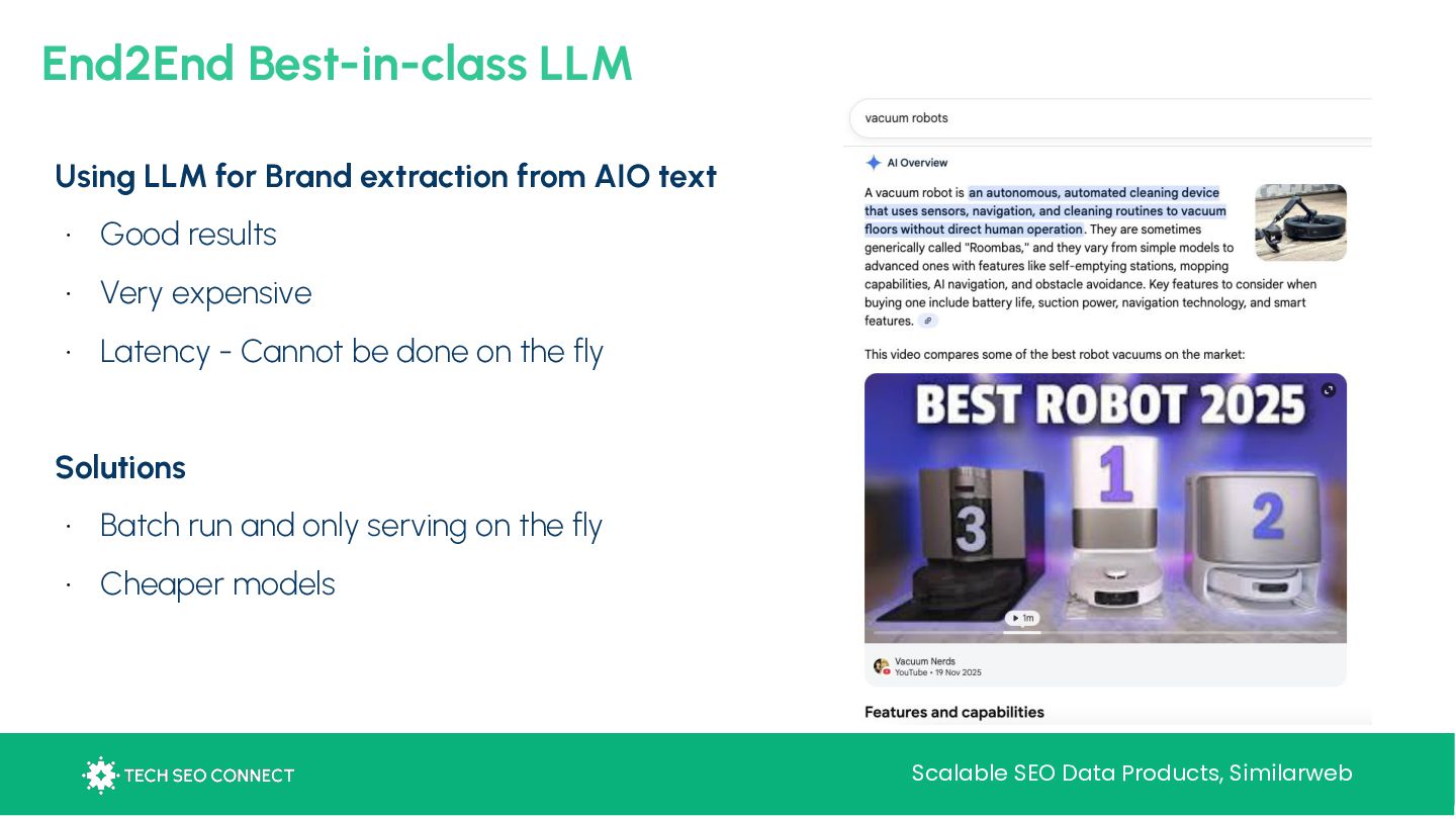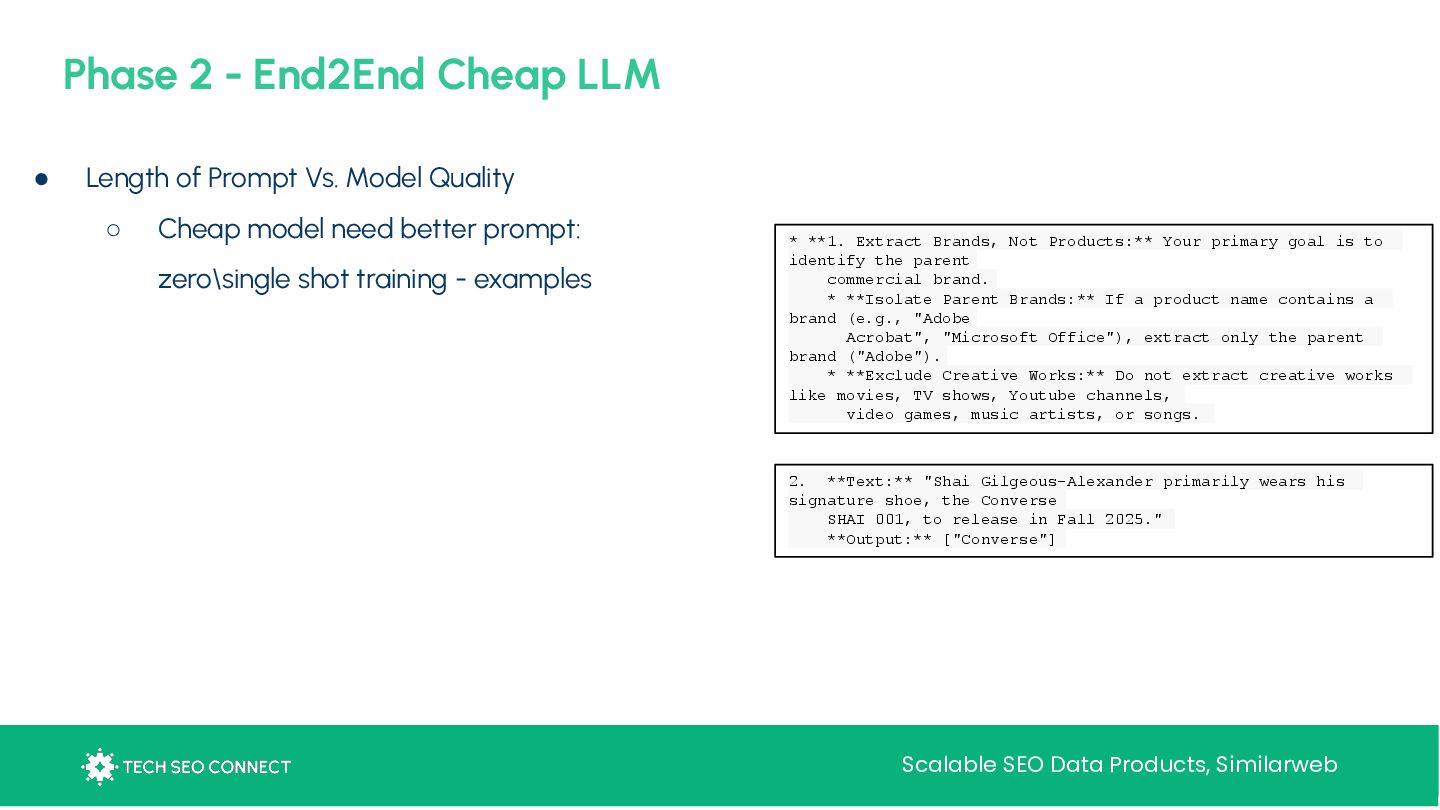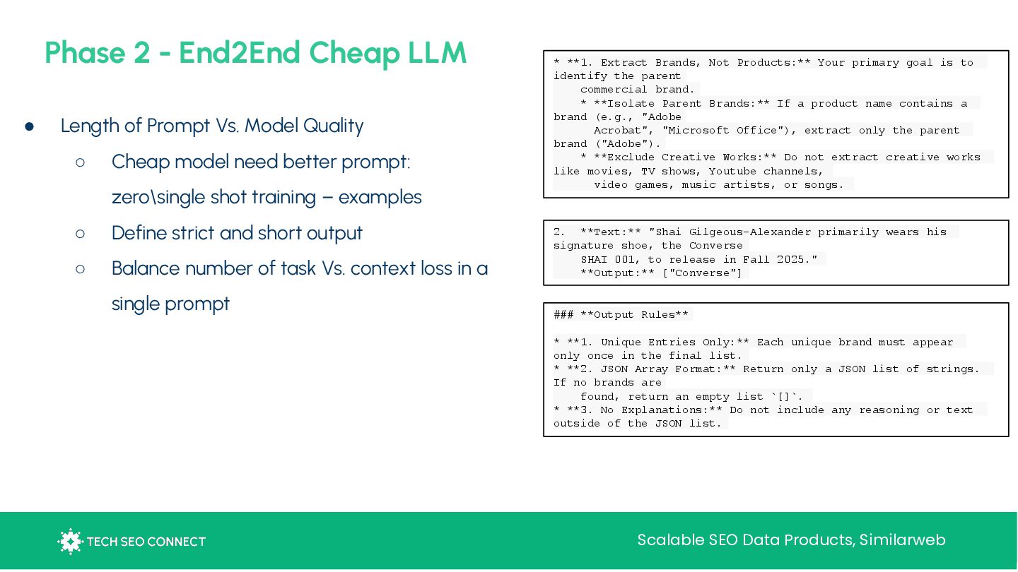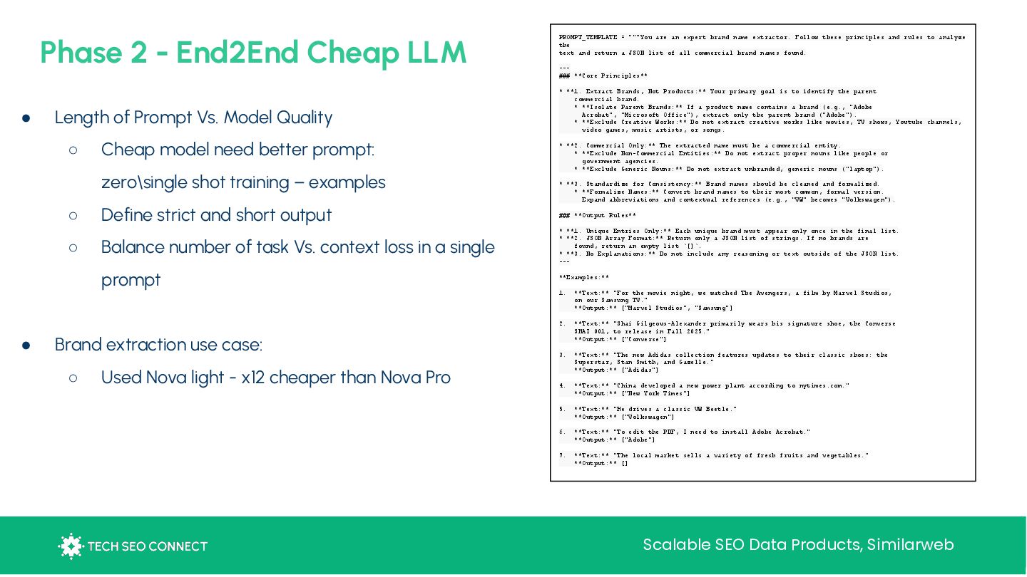 LLM • Length of Prompt Vs. Model Quality ◦ Cheap model need better prompt: zero\single shot training – examples ◦ Define strict and short output ◦ Balance number of task Vs. context loss in a single prompt • Brand extraction use case: ◦ Used Nova light - x12 cheaper than Nova Pro PROMPT_TEMPLATE = """You are an expert brand name extractor. Follow these principles and rules to analyze the text and return a JSON list of all commercial brand names found. --- ### **Core Principles** * **1. Extract Brands, Not Products:** Your primary goal is to identify the parent commercial brand. * **Isolate Parent Brands:** If a product name contains a brand (e.g., "Adobe Acrobat", "Microsoft Office"), extract only the parent brand ("Adobe"). * **Exclude Creative Works:** Do not extract creative works like movies, TV shows, Youtube channels, video games, music artists, or songs. * **2. Commercial Only:** The extracted name must be a commercial entity. * **Exclude Non-Commercial Entities:** Do not extract proper nouns like people or government agencies. * **Exclude Generic Nouns:** Do not extract unbranded, generic nouns ("laptop"). * **3. Standardize for Consistency:** Brand names should be cleaned and formalized. * **Formalize Names:** Convert brand names to their most common, formal version. Expand abbreviations and contextual references (e.g., "VW" becomes "Volkswagen"). ### **Output Rules** * **1. Unique Entries Only:** Each unique brand must appear only once in the final list. * **2. JSON Array Format:** Return only a JSON list of strings. If no brands are found, return an empty list `[]`. * **3. No Explanations:** Do not include any reasoning or text outside of the JSON list. --- **Examples:** 1. **Text:** "For the movie night, we watched The Avengers, a film by Marvel Studios, on our Samsung TV." **Output:** ["Marvel Studios", "Samsung"] 2. **Text:** "Shai Gilgeous-Alexander primarily wears his signature shoe, the Converse SHAI 001, to release in Fall 2025." **Output:** ["Converse"] 3. **Text:** "The new Adidas collection features updates to their classic shoes: the Superstar, Stan Smith, and Gazelle." **Output:** ["Adidas"] 4. **Text:** "China developed a new power plant according to nytimes.com." **Output:** ["New York Times"] 5. **Text:** "He drives a classic VW Beetle." **Output:** ["Volkswagen"] 6. **Text:** "To edit the PDF, I need to install Adobe Acrobat." **Output:** ["Adobe"] 7. **Text:** "The local market sells a variety of fresh fruits and vegetables." **Output:** []