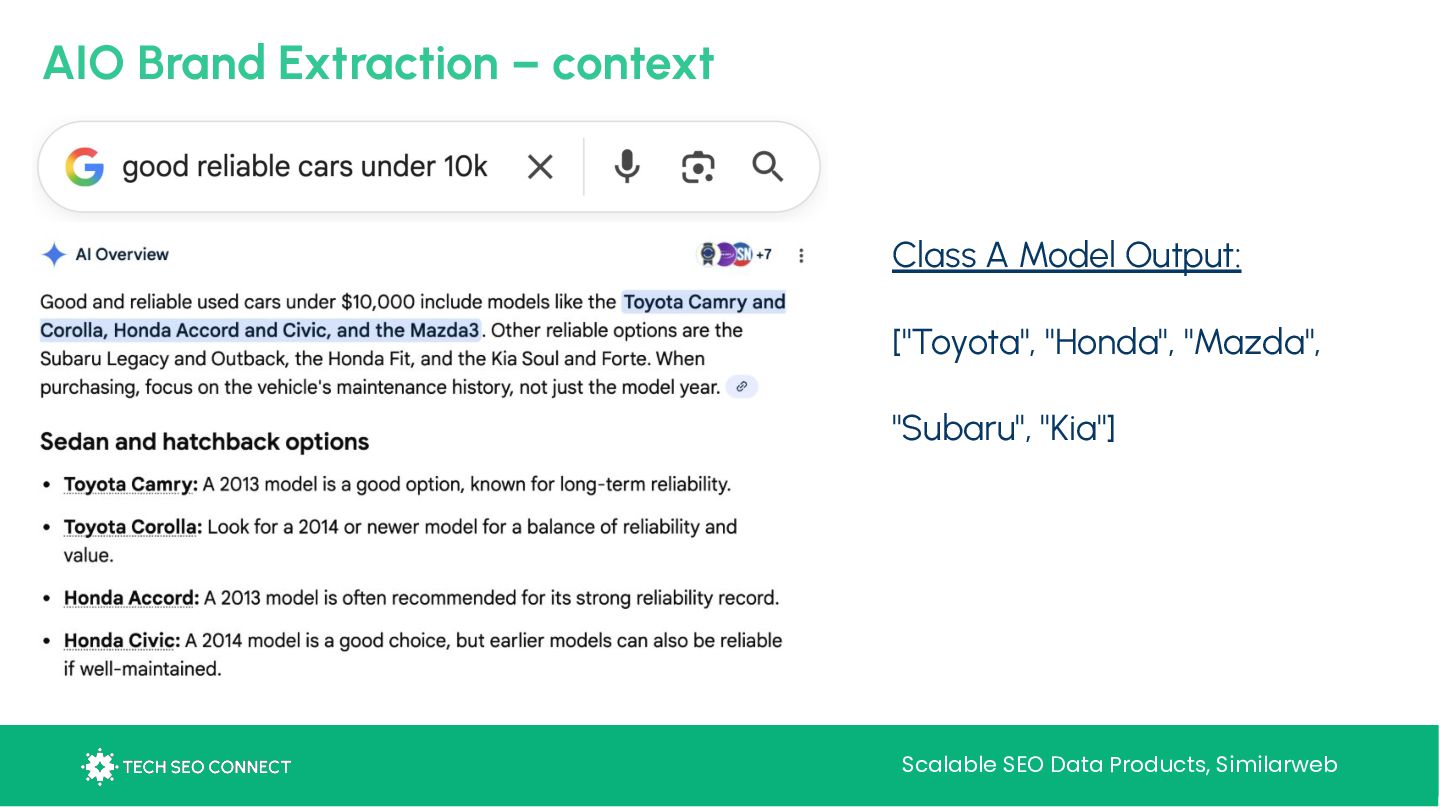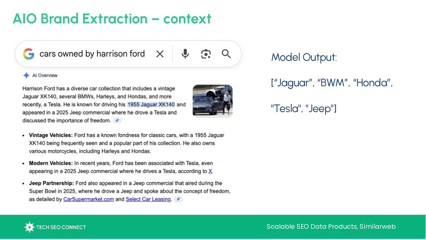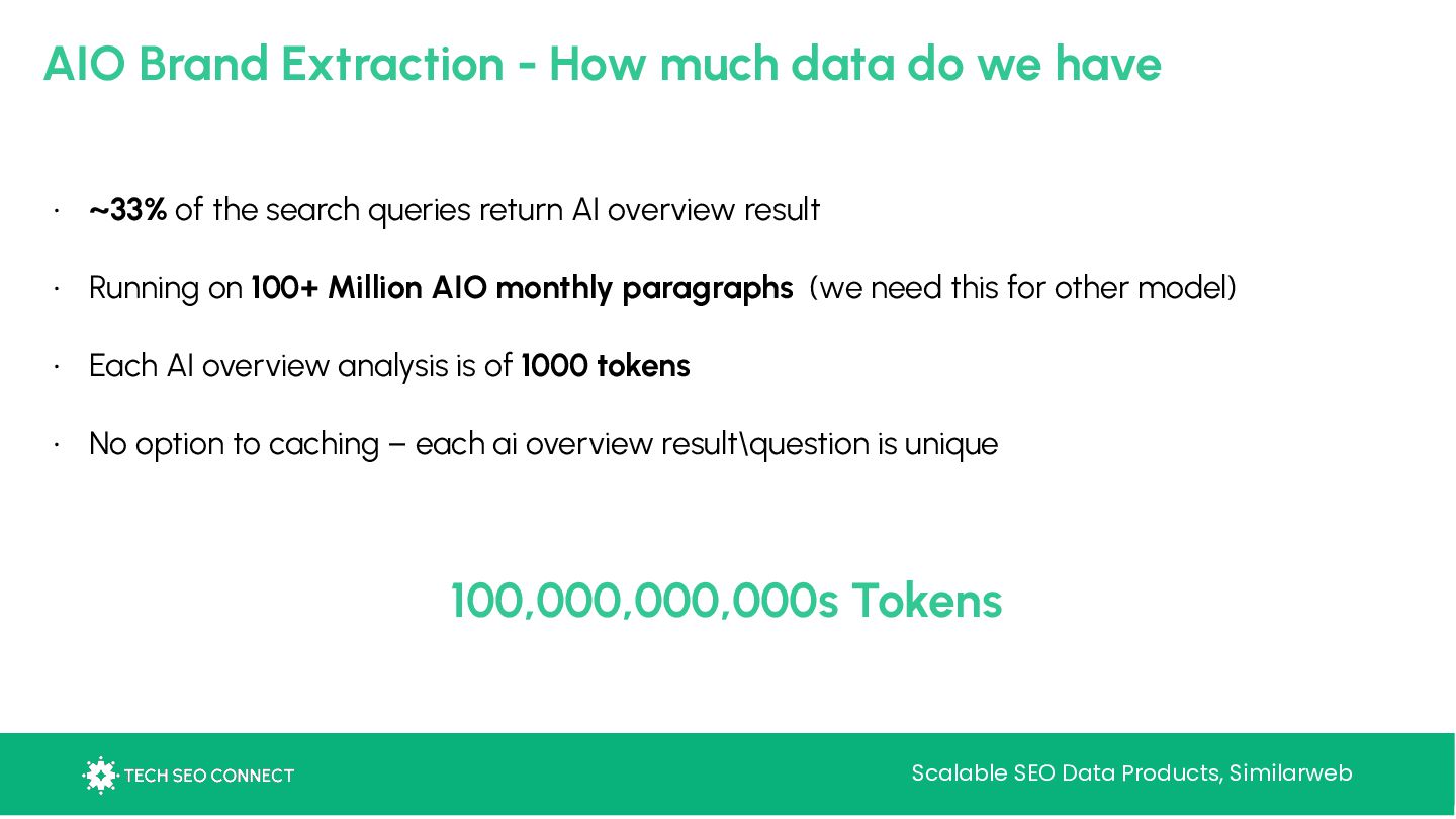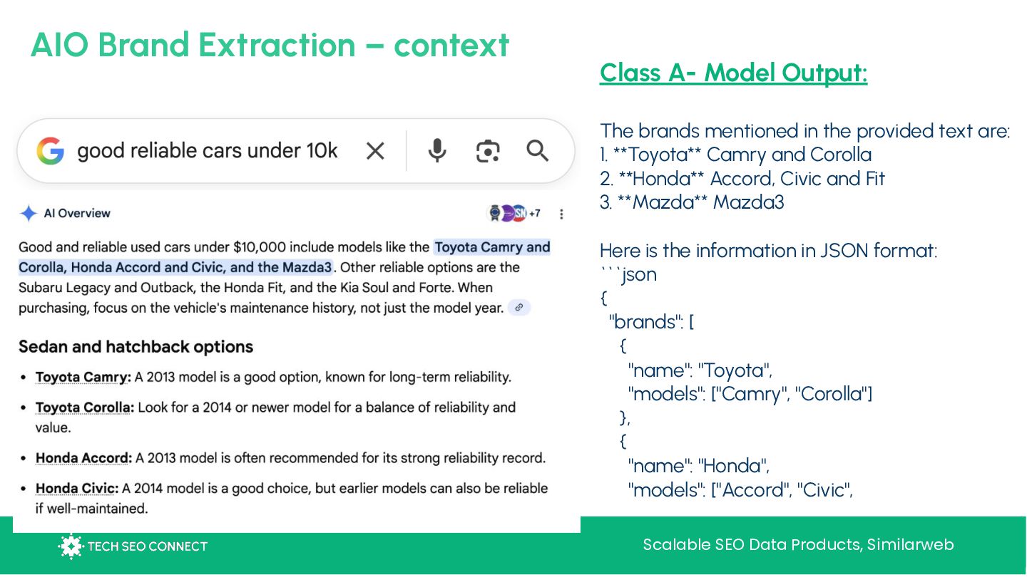 LLM • Length of Prompt Vs. Model Quality ◦ Cheap model need better prompt: zero\single shot training – examples ◦ Define strict and short output ◦ Balance number of task Vs. context loss in a single prompt • Brand extraction use case: ◦ Used Nova light - x12 cheaper than Nova Pro PROMPT_TEMPLATE = """You are an expert brand name extractor. Follow these principles and rules to analyze the text and return a JSON list of all commercial brand names found. --- ### **Core Principles** * **1. Extract Brands, Not Products:** Your primary goal is to identify the parent commercial brand. * **Isolate Parent Brands:** If a product name contains a brand (e.g., "Adobe Acrobat", "Microsoft Office"), extract only the parent brand ("Adobe"). * **Exclude Creative Works:** Do not extract creative works like movies, TV shows, Youtube channels, video games, music artists, or songs. * **2. Commercial Only:** The extracted name must be a commercial entity. * **Exclude Non-Commercial Entities:** Do not extract proper nouns like people or government agencies. * **Exclude Generic Nouns:** Do not extract unbranded, generic nouns ("laptop"). * **3. Standardize for Consistency:** Brand names should be cleaned and formalized. * **Formalize Names:** Convert brand names to their most common, formal version. Expand abbreviations and contextual references (e.g., "VW" becomes "Volkswagen"). ### **Output Rules** * **1. Unique Entries Only:** Each unique brand must appear only once in the final list. * **2. JSON Array Format:** Return only a JSON list of strings. If no brands are found, return an empty list `[]`. * **3. No Explanations:** Do not include any reasoning or text outside of the JSON list. --- **Examples:** 1. **Text:** "For the movie night, we watched The Avengers, a film by Marvel Studios, on our Samsung TV." **Output:** ["Marvel Studios", "Samsung"] 2. **Text:** "Shai Gilgeous-Alexander primarily wears his signature shoe, the Converse SHAI 001, to release in Fall 2025." **Output:** ["Converse"] 3. **Text:** "The new Adidas collection features updates to their classic shoes: the Superstar, Stan Smith, and Gazelle." **Output:** ["Adidas"] 4. **Text:** "China developed a new power plant according to nytimes.com." **Output:** ["New York Times"] 5. **Text:** "He drives a classic VW Beetle." **Output:** ["Volkswagen"] 6. **Text:** "To edit the PDF, I need to install Adobe Acrobat." **Output:** ["Adobe"] 7. **Text:** "The local market sells a variety of fresh fruits and vegetables." **Output:** []