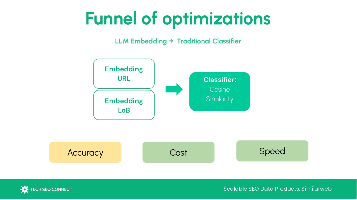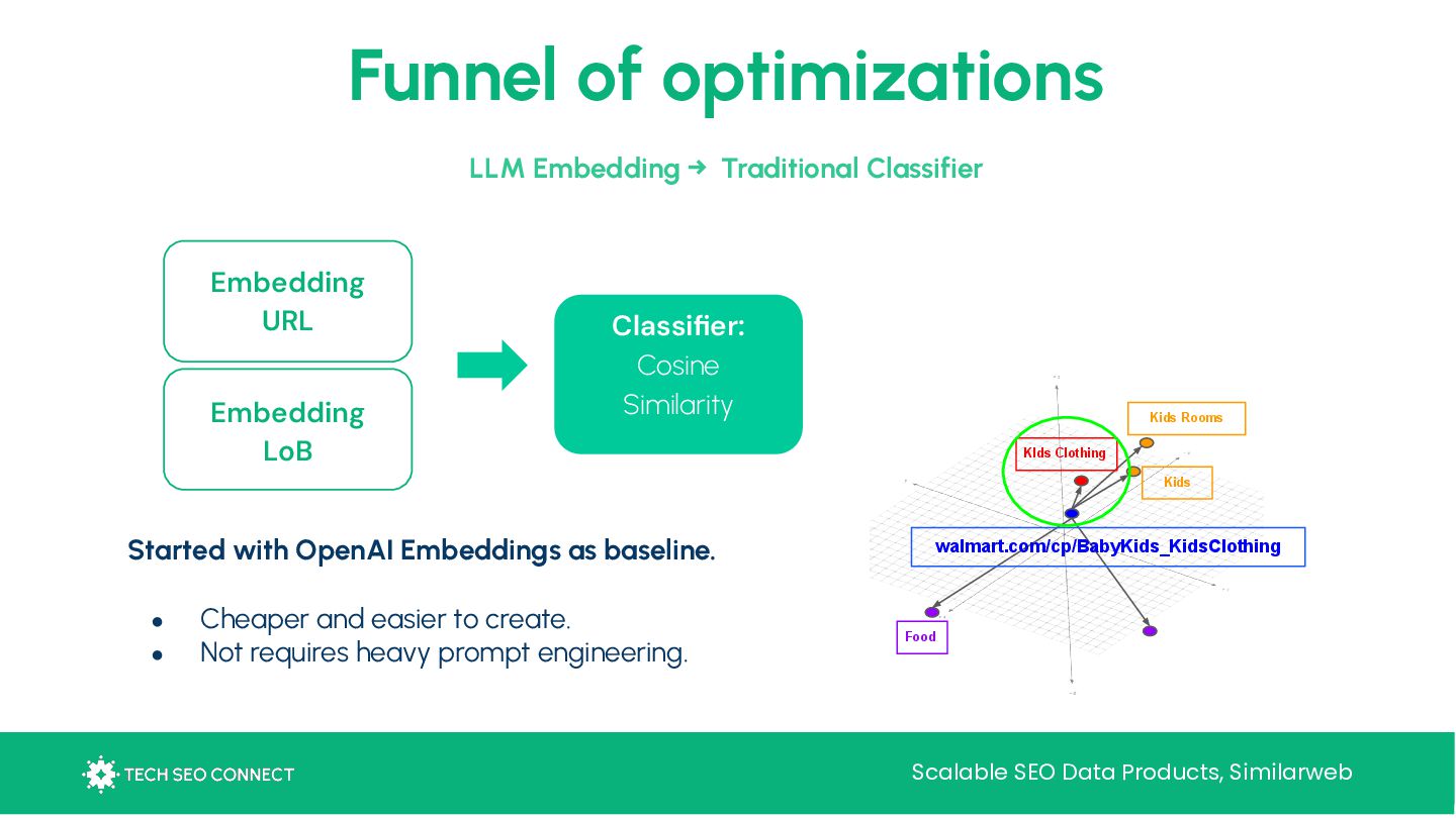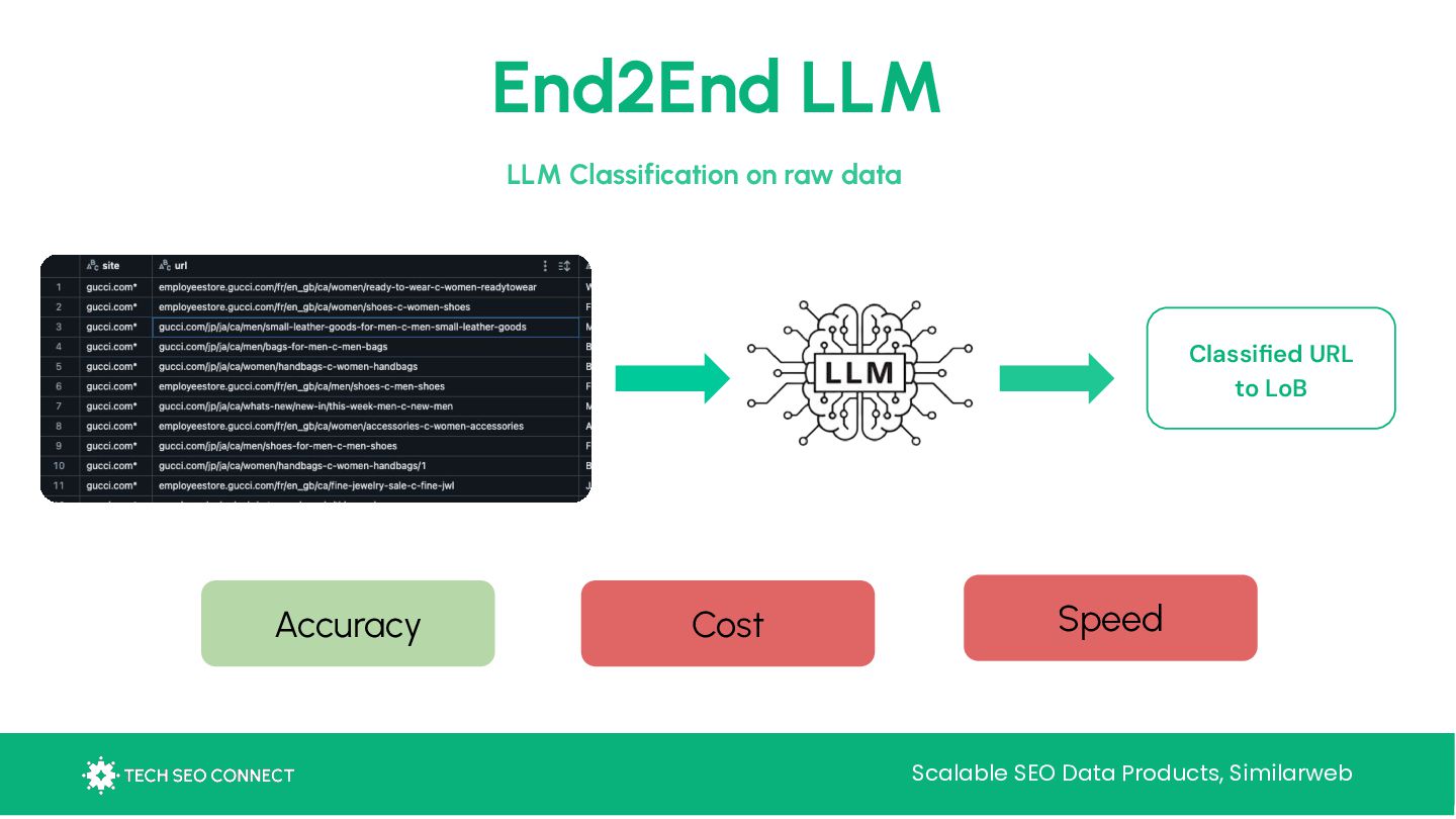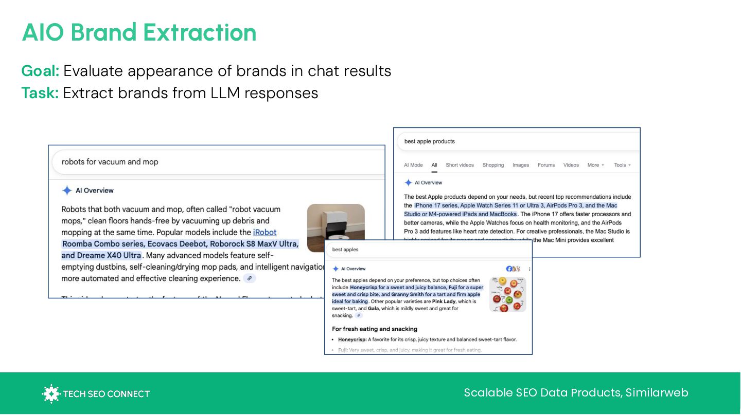 LLM • Length of Prompt Vs. Model Quality ◦ Cheap model need better prompt: zero\single shot training – examples ◦ Define strict and short output ◦ Balance number of task Vs. context loss in a single prompt • Brand extraction use case: ◦ Used Nova light - x12 cheaper than Nova Pro PROMPT_TEMPLATE = """You are an expert brand name extractor. Follow these principles and rules to analyze the text and return a JSON list of all commercial brand names found. --- ### **Core Principles** * **1. Extract Brands, Not Products:** Your primary goal is to identify the parent commercial brand. * **Isolate Parent Brands:** If a product name contains a brand (e.g., "Adobe Acrobat", "Microsoft Office"), extract only the parent brand ("Adobe"). * **Exclude Creative Works:** Do not extract creative works like movies, TV shows, Youtube channels, video games, music artists, or songs. * **2. Commercial Only:** The extracted name must be a commercial entity. * **Exclude Non-Commercial Entities:** Do not extract proper nouns like people or government agencies. * **Exclude Generic Nouns:** Do not extract unbranded, generic nouns ("laptop"). * **3. Standardize for Consistency:** Brand names should be cleaned and formalized. * **Formalize Names:** Convert brand names to their most common, formal version. Expand abbreviations and contextual references (e.g., "VW" becomes "Volkswagen"). ### **Output Rules** * **1. Unique Entries Only:** Each unique brand must appear only once in the final list. * **2. JSON Array Format:** Return only a JSON list of strings. If no brands are found, return an empty list `[]`. * **3. No Explanations:** Do not include any reasoning or text outside of the JSON list. --- **Examples:** 1. **Text:** "For the movie night, we watched The Avengers, a film by Marvel Studios, on our Samsung TV." **Output:** ["Marvel Studios", "Samsung"] 2. **Text:** "Shai Gilgeous-Alexander primarily wears his signature shoe, the Converse SHAI 001, to release in Fall 2025." **Output:** ["Converse"] 3. **Text:** "The new Adidas collection features updates to their classic shoes: the Superstar, Stan Smith, and Gazelle." **Output:** ["Adidas"] 4. **Text:** "China developed a new power plant according to nytimes.com." **Output:** ["New York Times"] 5. **Text:** "He drives a classic VW Beetle." **Output:** ["Volkswagen"] 6. **Text:** "To edit the PDF, I need to install Adobe Acrobat." **Output:** ["Adobe"] 7. **Text:** "The local market sells a variety of fresh fruits and vegetables." **Output:** []