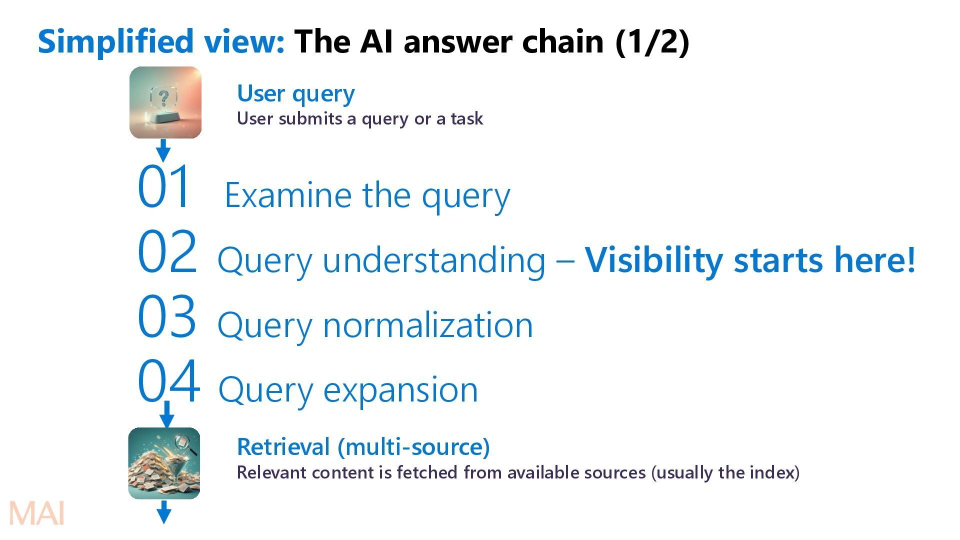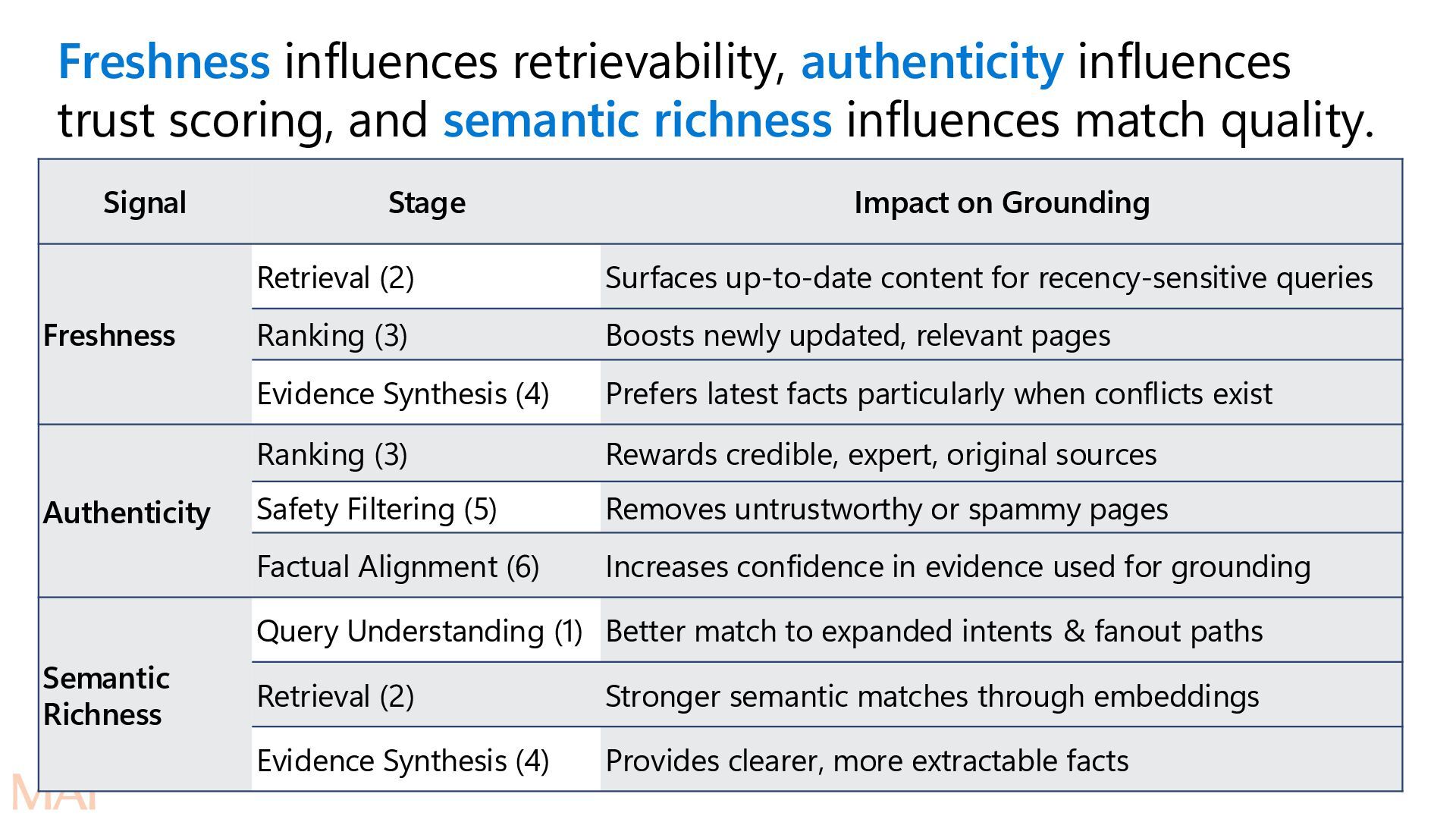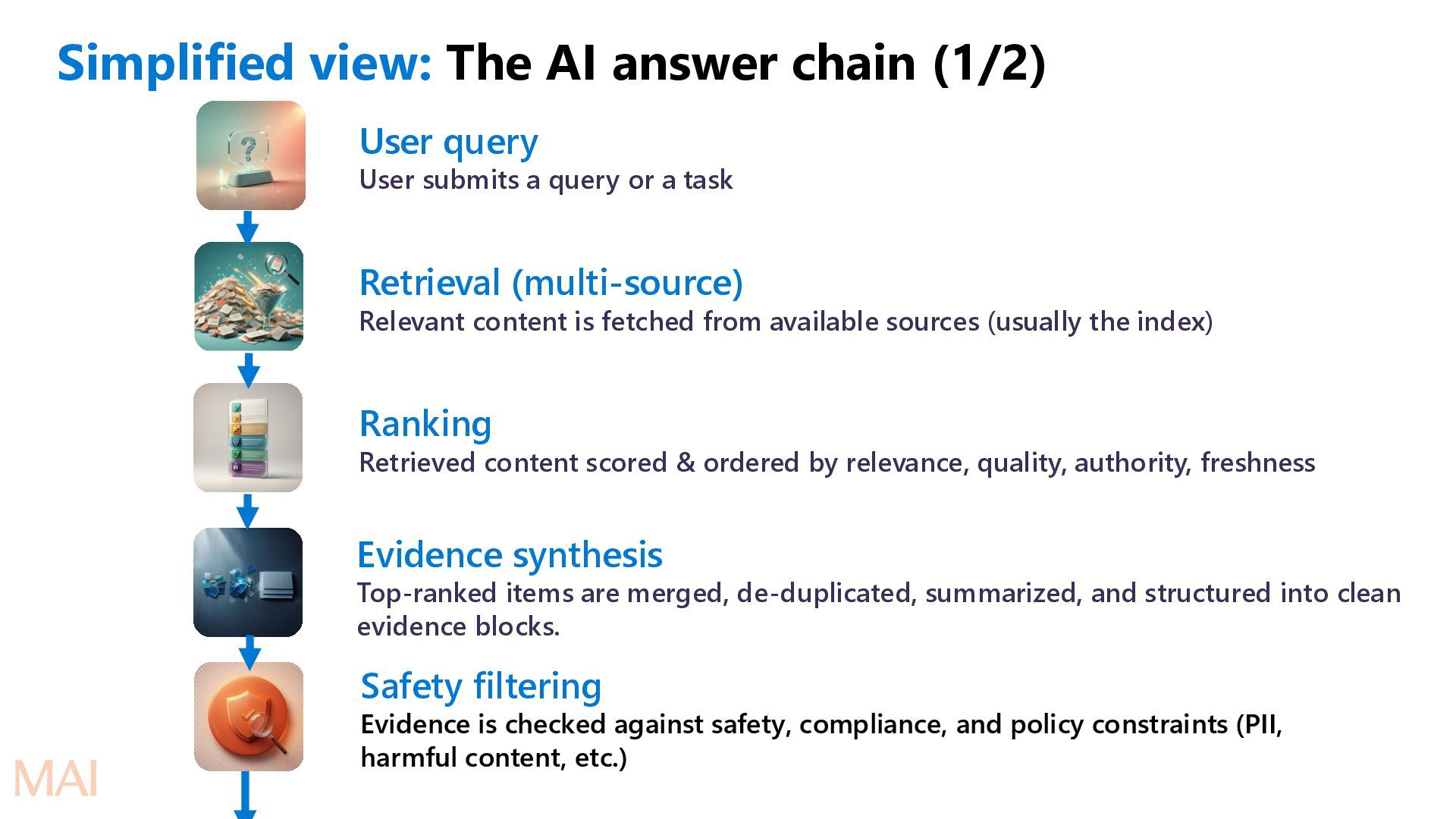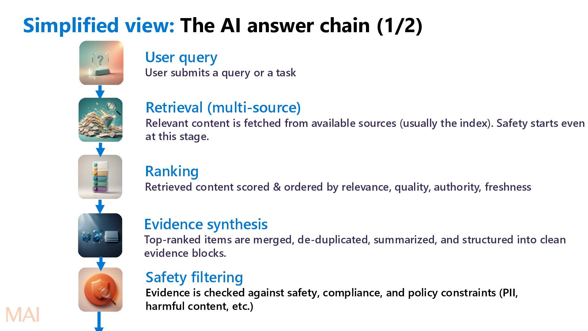 submits a query or a task Retrieval (multi-source) Relevant content is fetched from available sources (usually the index). Safety starts even at this stage. Ranking Retrieved content scored & ordered by relevance, quality, authority, freshness Evidence synthesis Top-ranked items are merged, de-duplicated, summarized, and structured into clean evidence blocks. Safety filtering Evidence is checked against safety, compliance, and policy constraints (PII, harmful content, etc.)