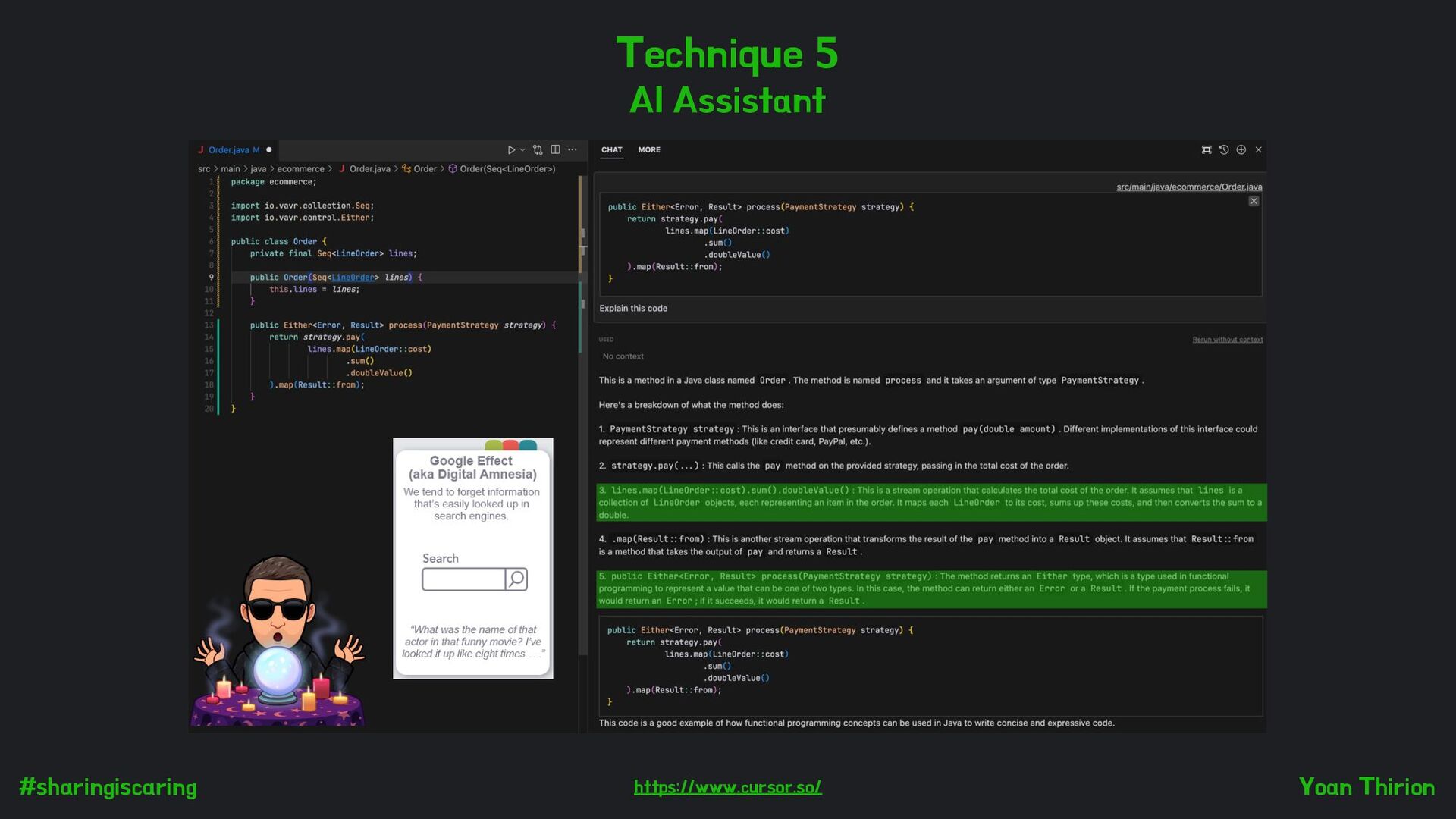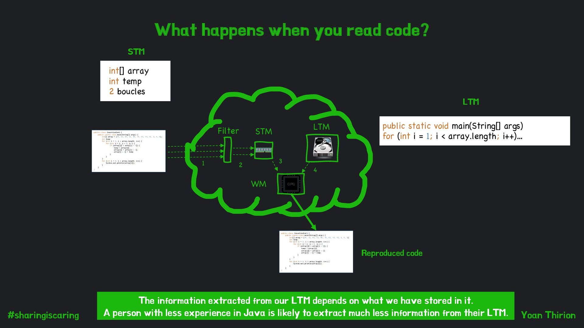 STM Filter STM LTM WM 1 2 4 3 public class InsertionSort { public static void main(String[] args) { int[] array = {45, 12, 85, 32, 89, 39, 69, 44, 42, 1, 6, 8}; int temp; for (int i = 1; i < array.length; i++) { for (int j = i; j > 0; j--) { if (array[j] < array[j - 1]) { temp = array[j]; array[j] = array[j - 1]; array[j - 1] = temp; } } } for (int i = 0; i < array.length; i++) { System.out.println(array[i]); } } } int[] array int temp 2 boucles public static void main(String[] args) for (int i = 1; i < array.length; i++)… public class InsertionSort { public static void main(String[] args) { int[] array = {45, 12, 85, 32, 89, 39, 69, 44, 42, 1, 6, 8}; int temp; for (int i = 1; i < array.length; i++) { for (int j = i; j > 0; j--) { if (array[j] < array[j - 1]) { temp = array[j]; array[j] = array[j - 1]; array[j - 1] = temp; } } } for (int i = 0; i < array.length; i++) { System.out.println(array[i]); } } } Reproduced code The information extracted from our LTM depends on what we have stored in it. A person with less experience in Java is likely to extract much less information from their LTM.