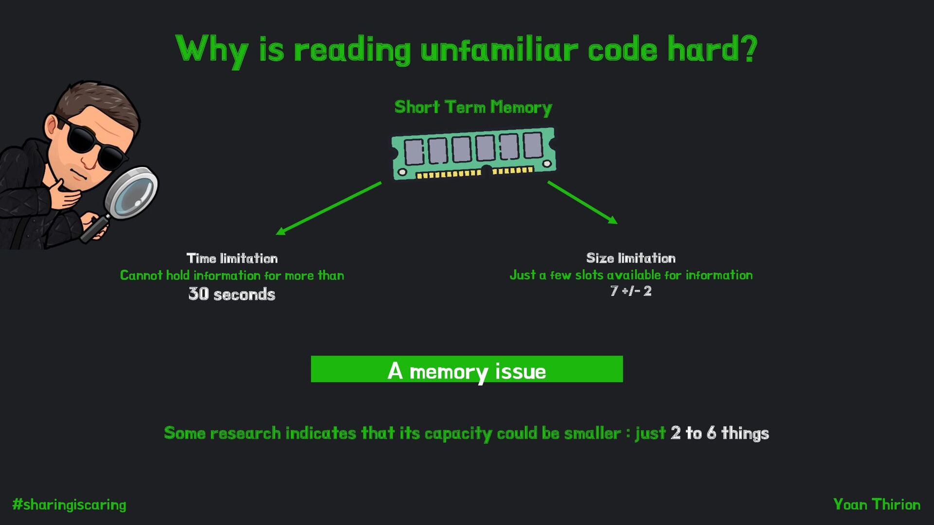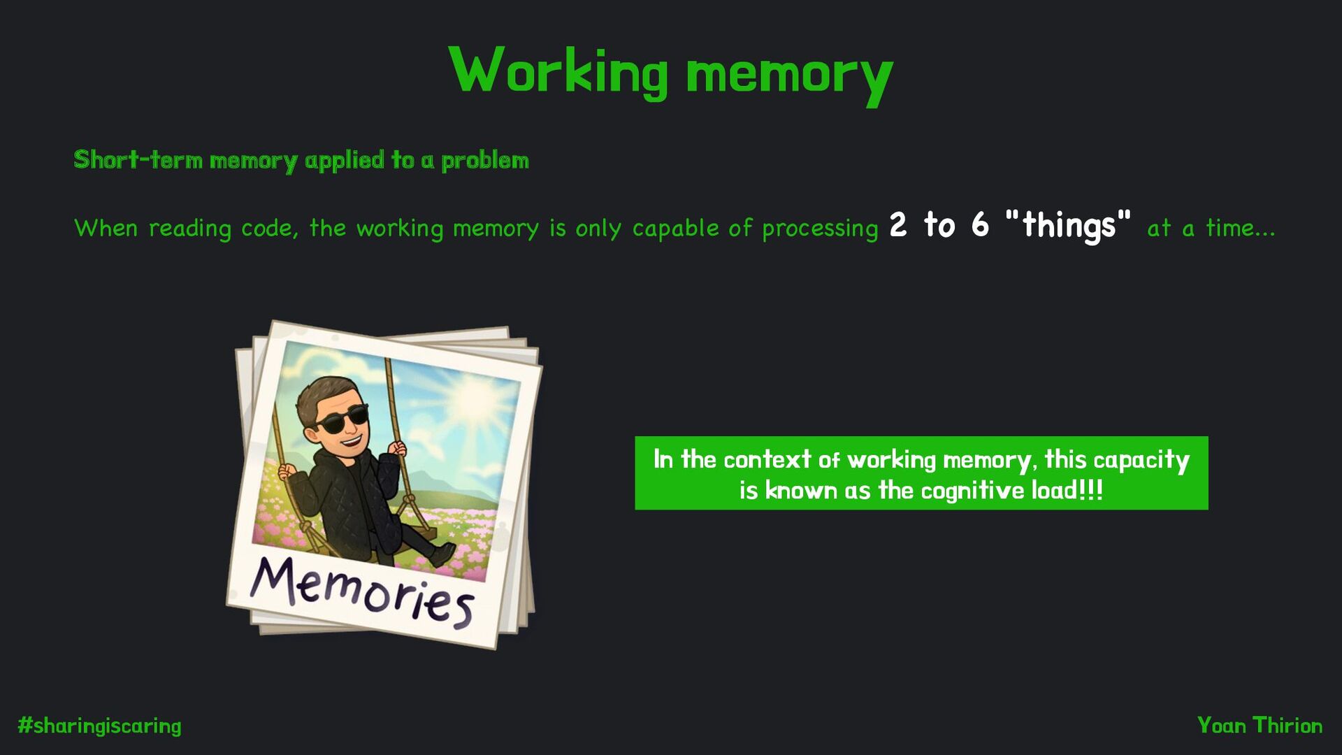 problem When reading code, the working memory is only capable of processing 2 to 6 "things" at a time... In the context of working memory, this capacity is known as the cognitive load!!!