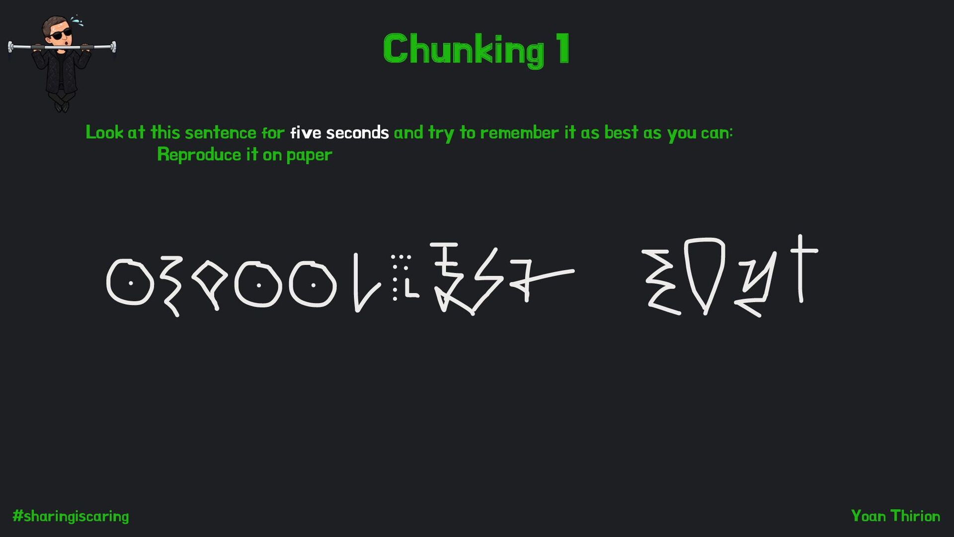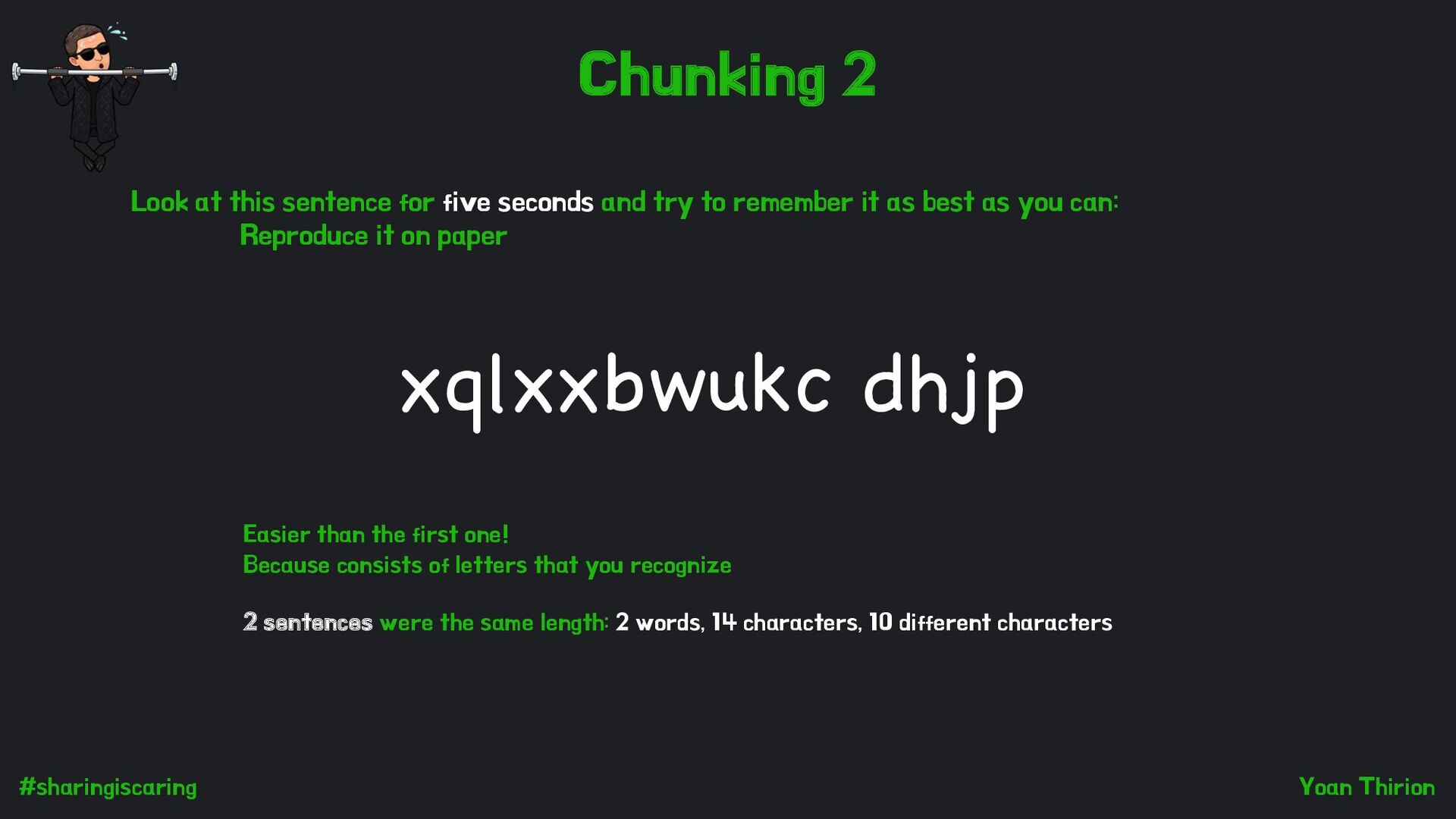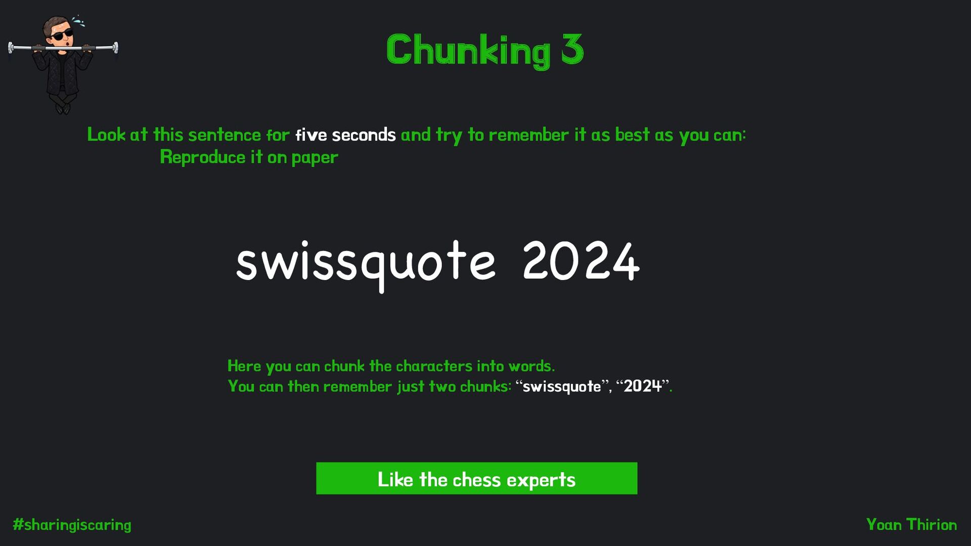 chunk the characters into words. You can then remember just two chunks: “swissquote”, “2024”. Like the chess experts Look at this sentence for five seconds and try to remember it as best as you can: Reproduce it on paper