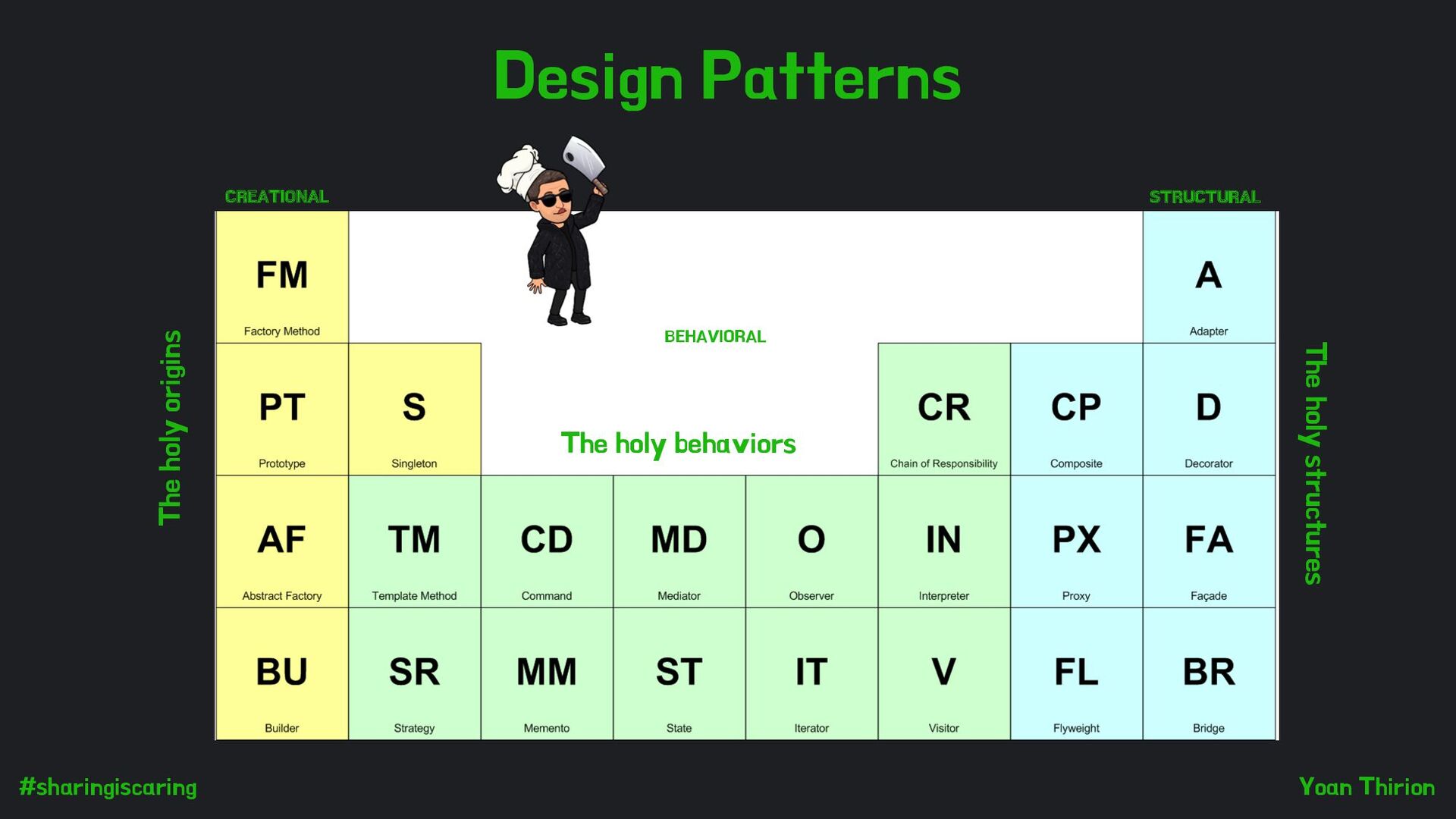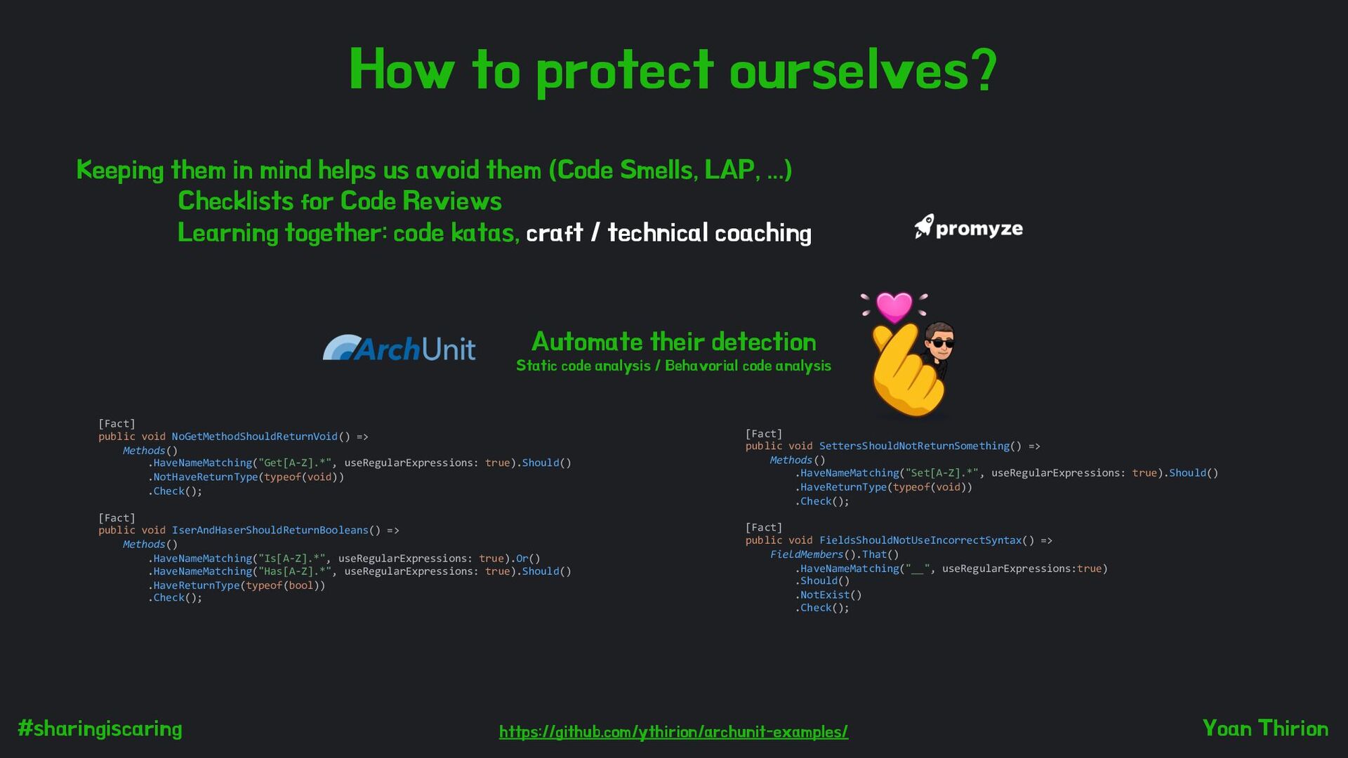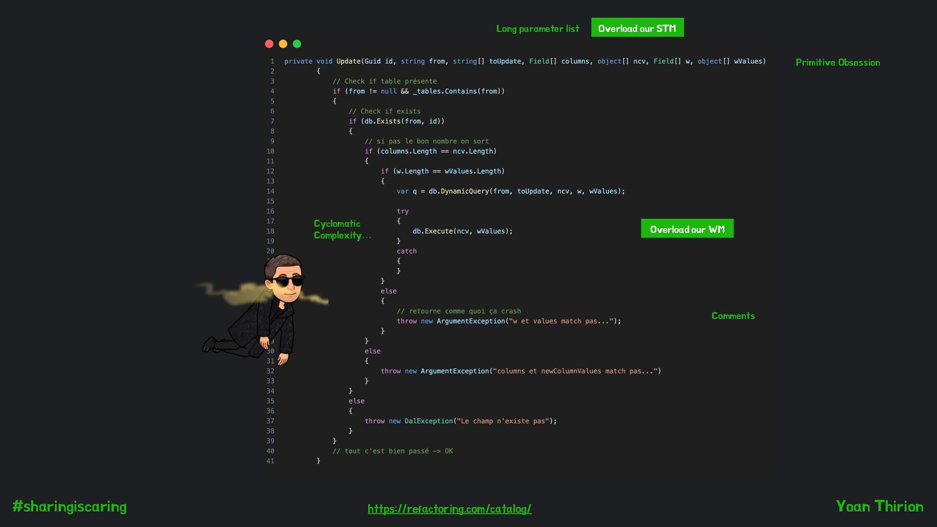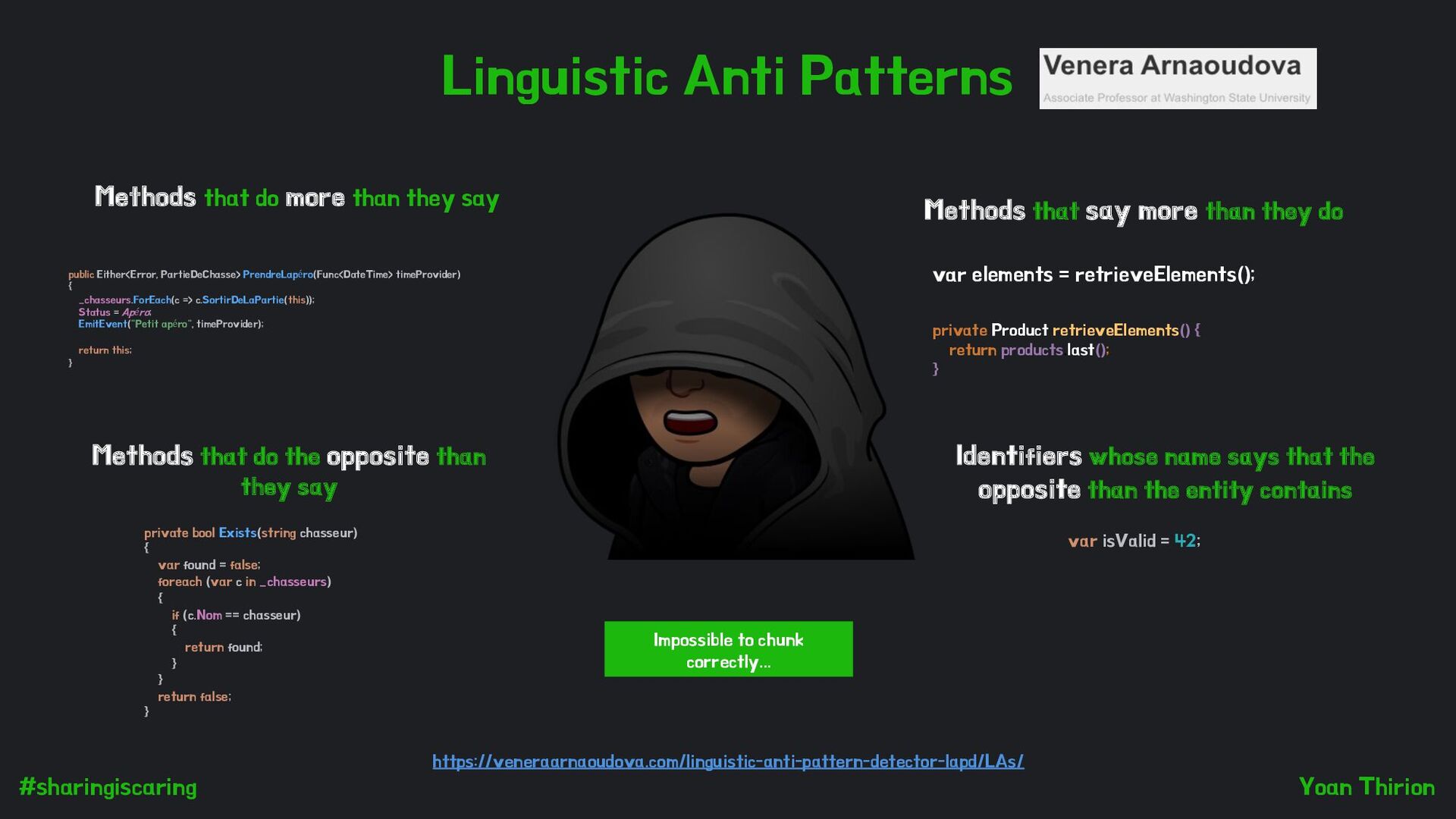 more than they do Identifiers whose name says that the opposite than the entity contains Methods that do more than they say Methods that do the opposite than they say var elements = retrieveElements(); private Product retrieveElements() { return products.last(); } public Either<Error, PartieDeChasse> PrendreLapéro(Func<DateTime> timeProvider) { _chasseurs.ForEach(c => c.SortirDeLaPartie(this)); Status = Apéro; EmitEvent("Petit apéro", timeProvider); return this; } private bool Exists(string chasseur) { var found = false; foreach (var c in _chasseurs) { if (c.Nom == chasseur) { return found; } } return false; } var isValid = 42; Impossible to chunk correctly...