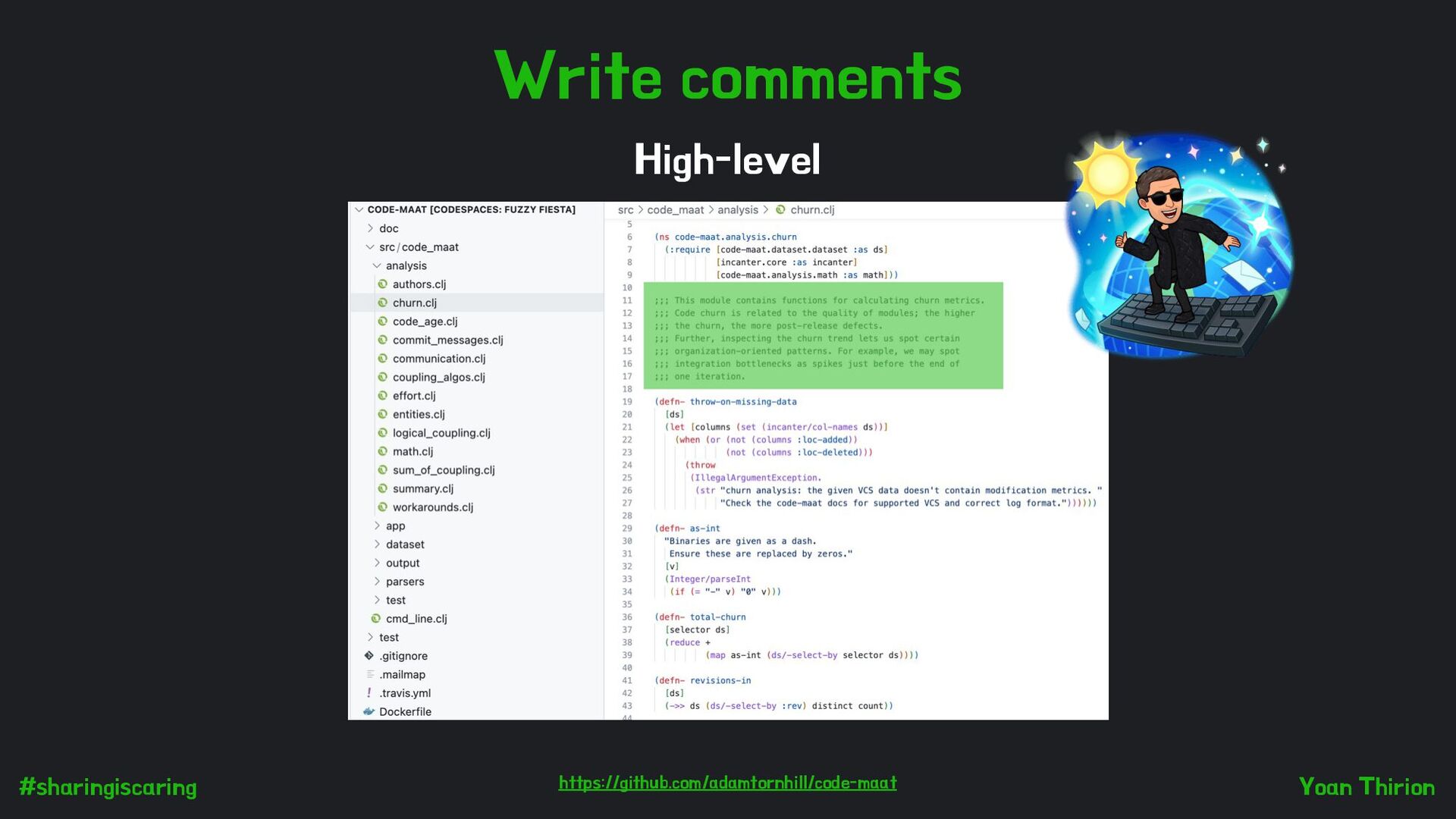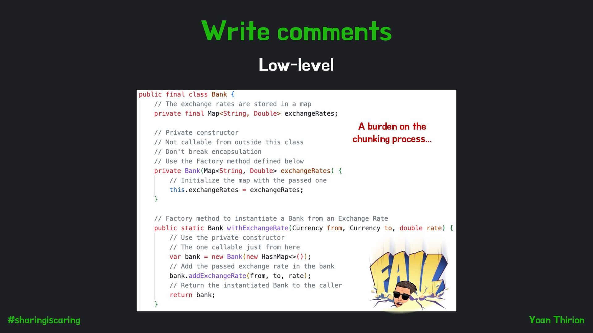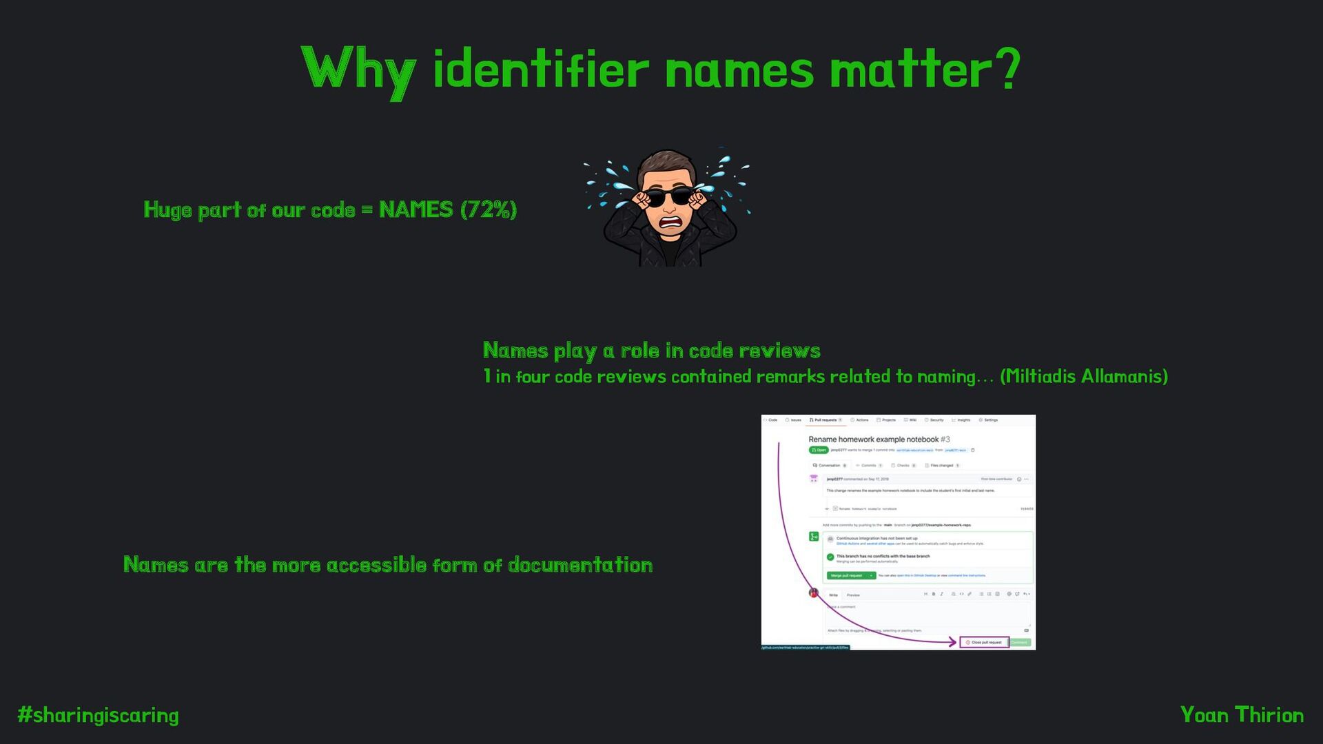 our code = NAMES (72%) Names play a role in code reviews 1 in four code reviews contained remarks related to naming… (Miltiadis Allamanis) Names are the more accessible form of documentation