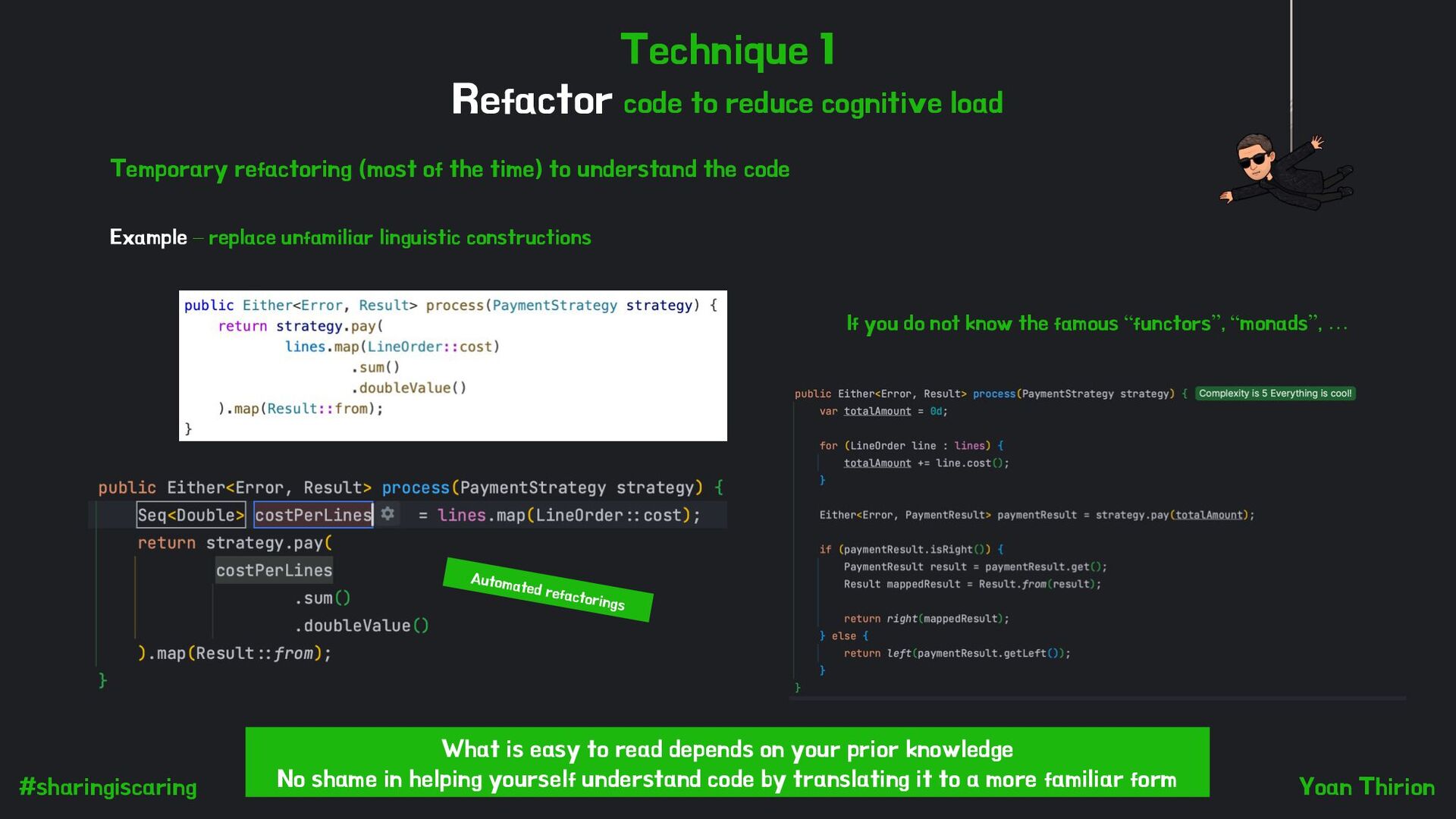 load Temporary refactoring (most of the time) to understand the code Example – replace unfamiliar linguistic constructions If you do not know the famous “functors”, “monads”, … What is easy to read depends on your prior knowledge No shame in helping yourself understand code by translating it to a more familiar form Automated refactorings