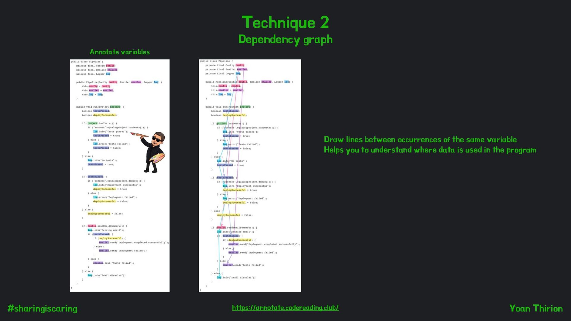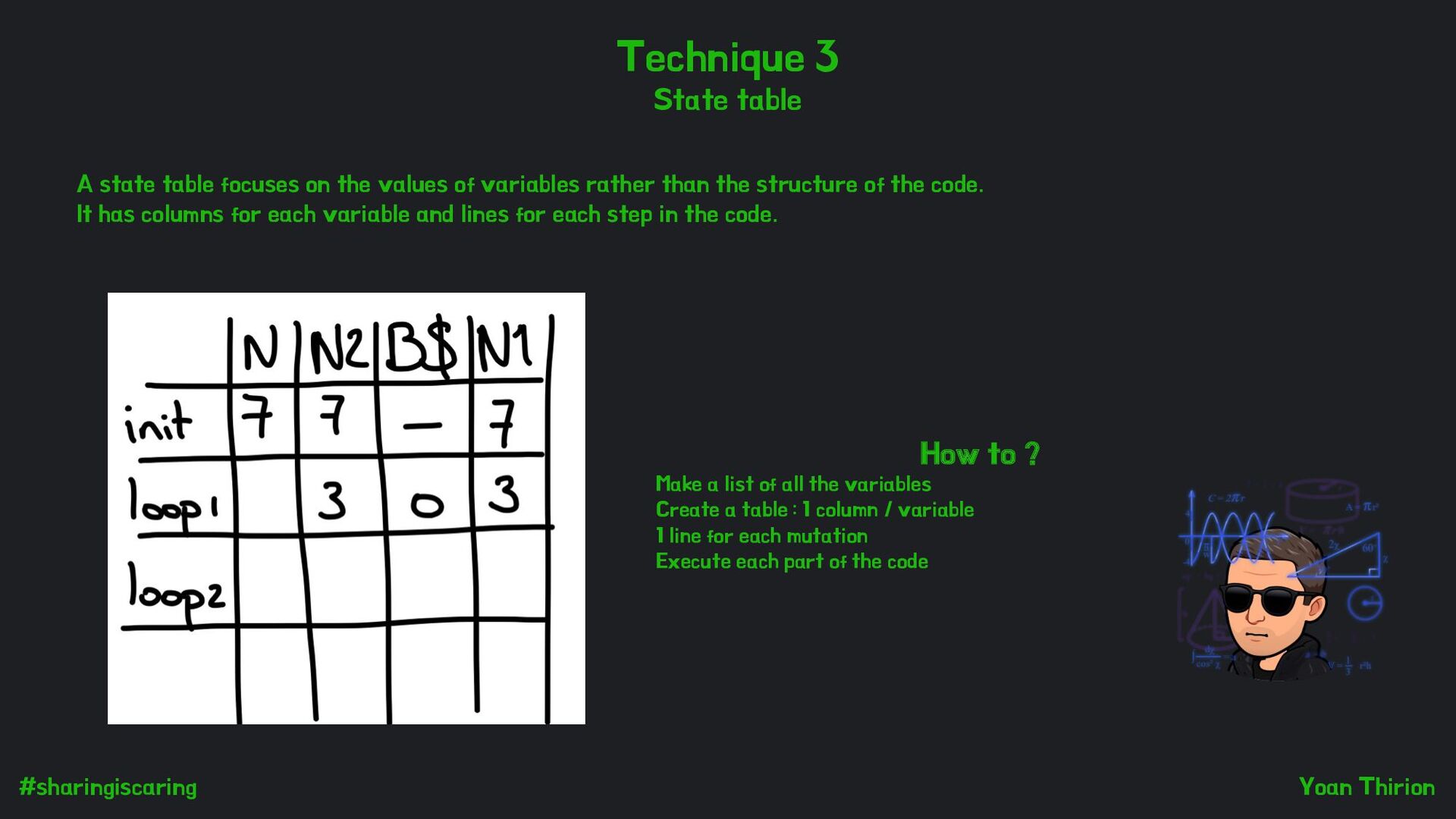focuses on the values of variables rather than the structure of the code. It has columns for each variable and lines for each step in the code. How to ? Make a list of all the variables Create a table : 1 column / variable 1 line for each mutation Execute each part of the code