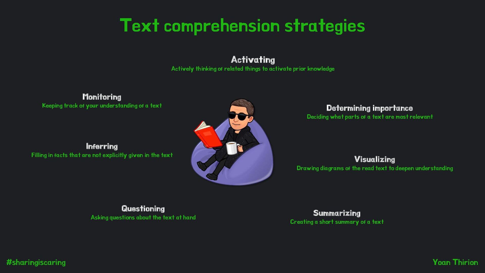 related things to activate prior knowledge Determining importance Deciding what parts of a text are most relevant Visualizing Drawing diagrams of the read text to deepen understanding Inferring Filling in facts that are not explicitly given in the text Summarizing Creating a short summary of a text Questioning Asking questions about the text at hand Monitoring Keeping track of your understanding of a text