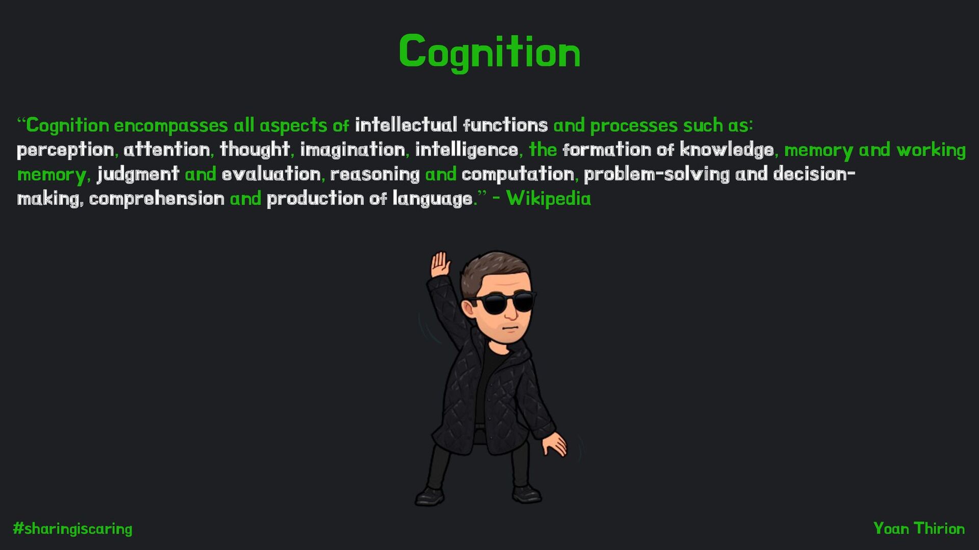 functions and processes such as: perception, attention, thought, imagination, intelligence, the formation of knowledge, memory and working memory, judgment and evaluation, reasoning and computation, problem-solving and decision- making, comprehension and production of language.” - Wikipedia