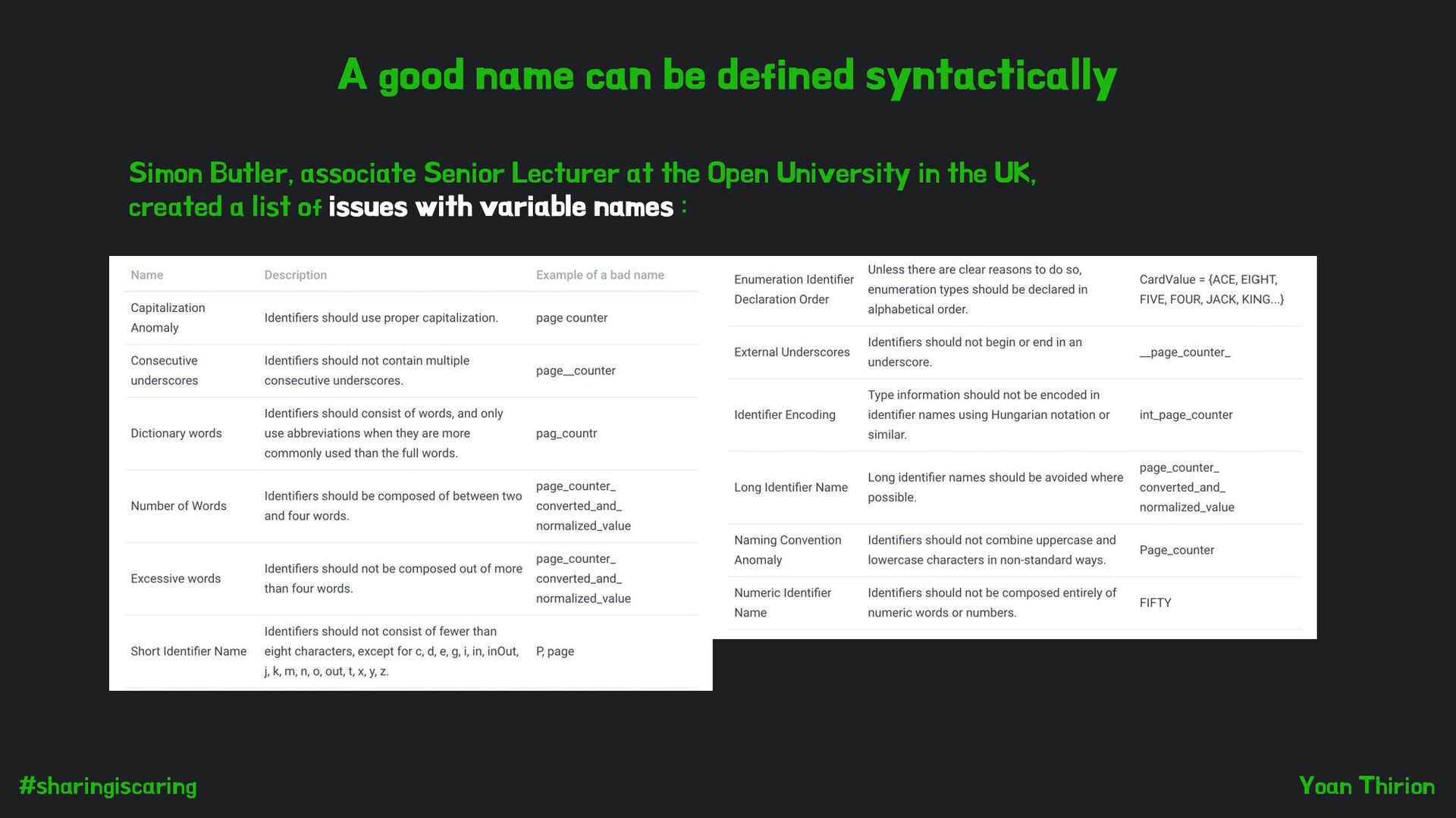 7 open-source projects : 11% of setters: also return a value in addition to setting a field 2,5% of methods: method name and the corresponding comment gave opposite descriptions of the working of the method 64% of identifiers starting with ‘is’ turned out not to be Boolean