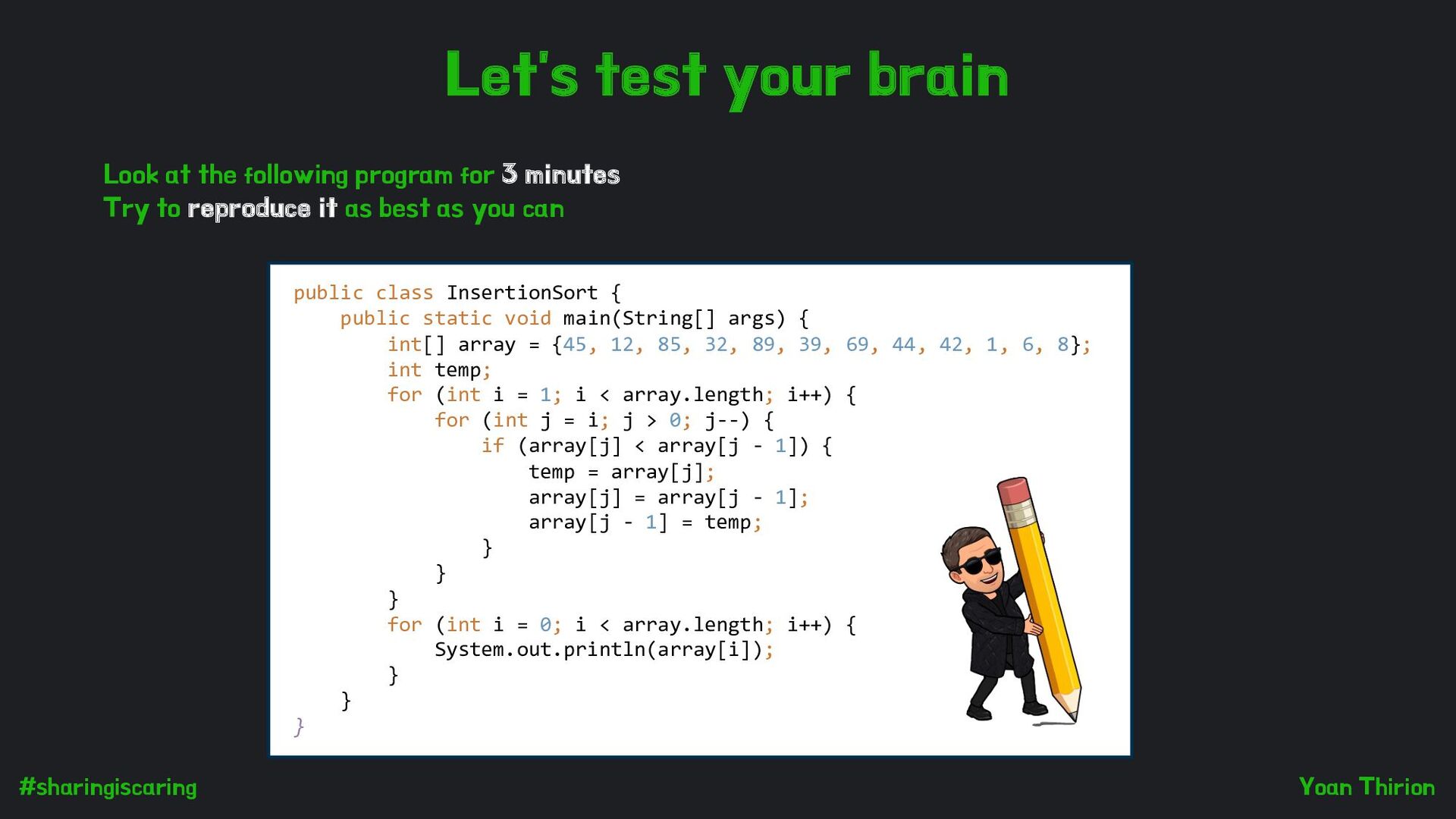 following program for 3 minutes Try to reproduce it as best as you can public class InsertionSort { public static void main(String[] args) { int[] array = {45, 12, 85, 32, 89, 39, 69, 44, 42, 1, 6, 8}; int temp; for (int i = 1; i < array.length; i++) { for (int j = i; j > 0; j--) { if (array[j] < array[j - 1]) { temp = array[j]; array[j] = array[j - 1]; array[j - 1] = temp; } } } for (int i = 0; i < array.length; i++) { System.out.println(array[i]); } } }
