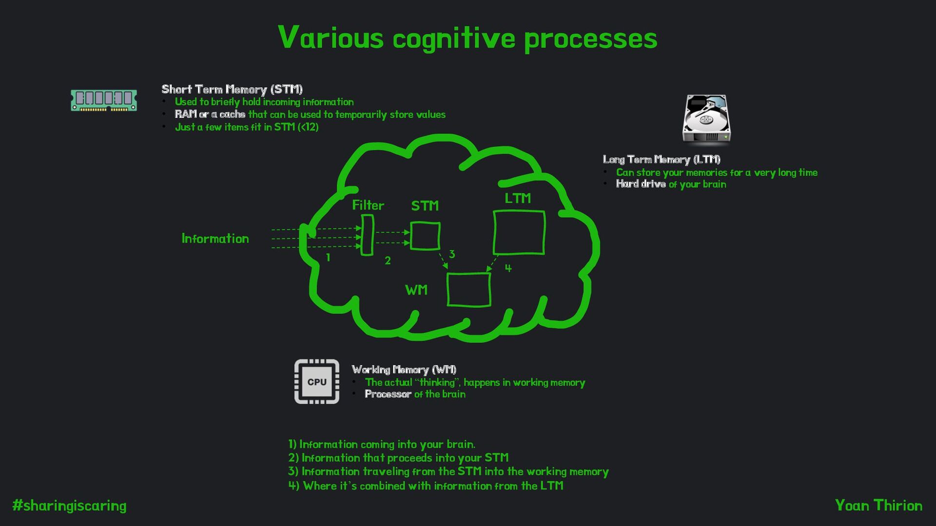 your brain. 2) Information that proceeds into your STM 3) Information traveling from the STM into the working memory 4) Where it’s combined with information from the LTM Long Term Memory (LTM) • Can store your memories for a very long time • Hard drive of your brain Short Term Memory (STM) • Used to briefly hold incoming information • RAM or a cache that can be used to temporarily store values • Just a few items fit in STM (<12) Information Filter STM LTM WM Working Memory (WM) • The actual “thinking”, happens in working memory • Processor of the brain 1 2 3 4