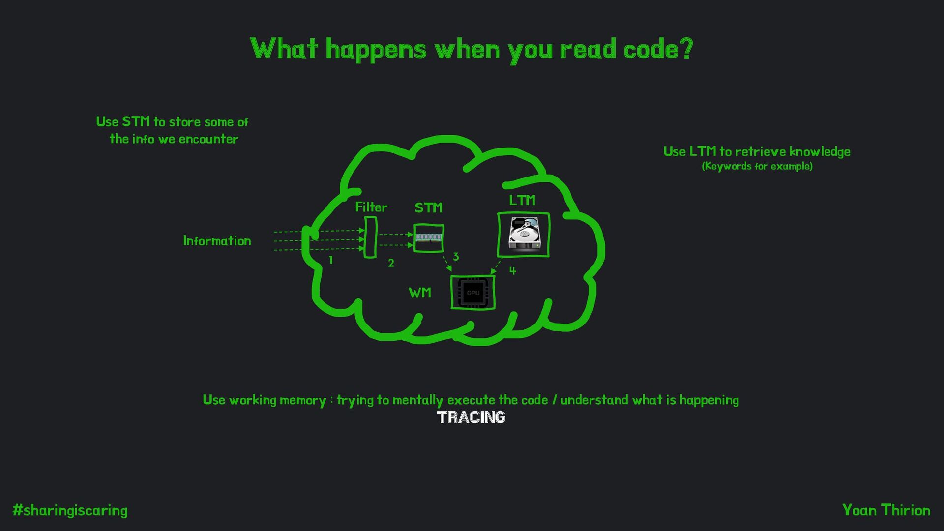 LTM to retrieve knowledge (Keywords for example) Use STM to store some of the info we encounter Use working memory : trying to mentally execute the code / understand what is happening TRACING Information Filter STM LTM WM 1 2 4 3