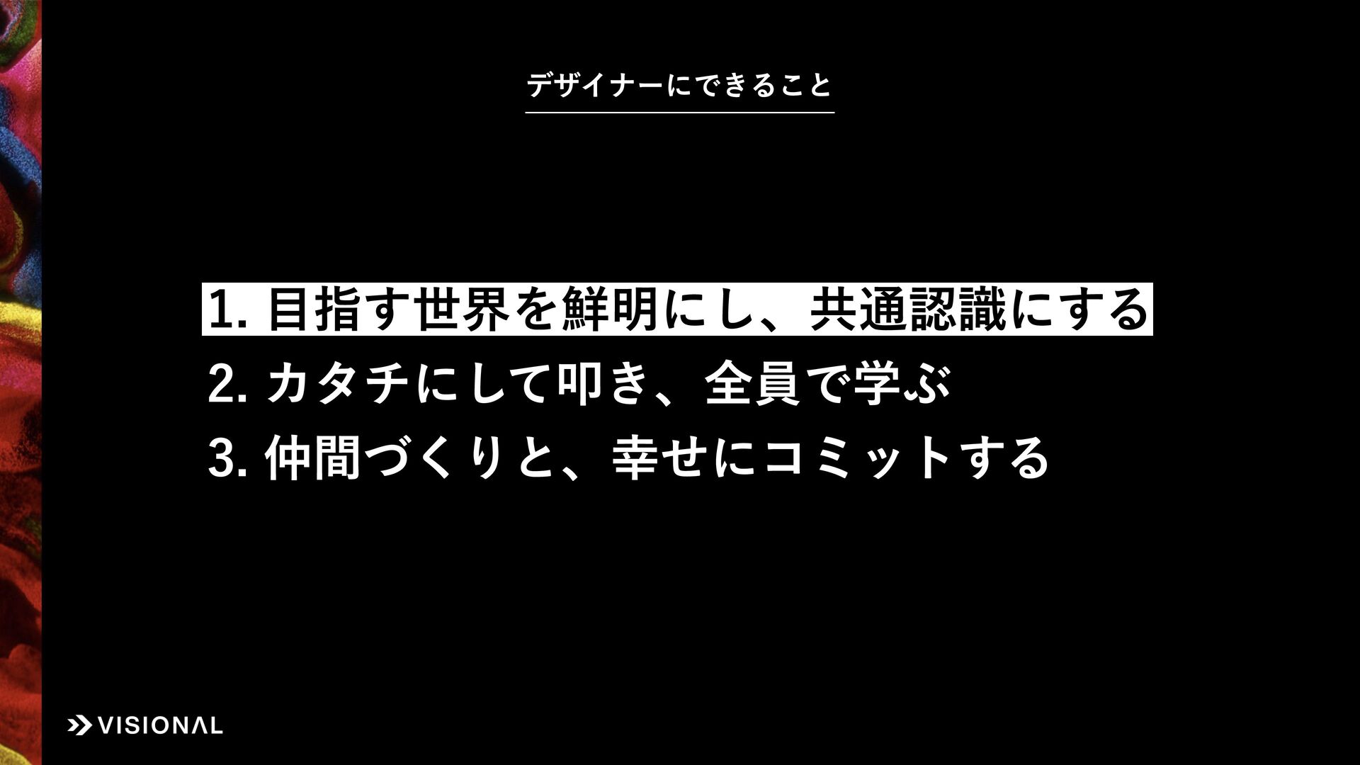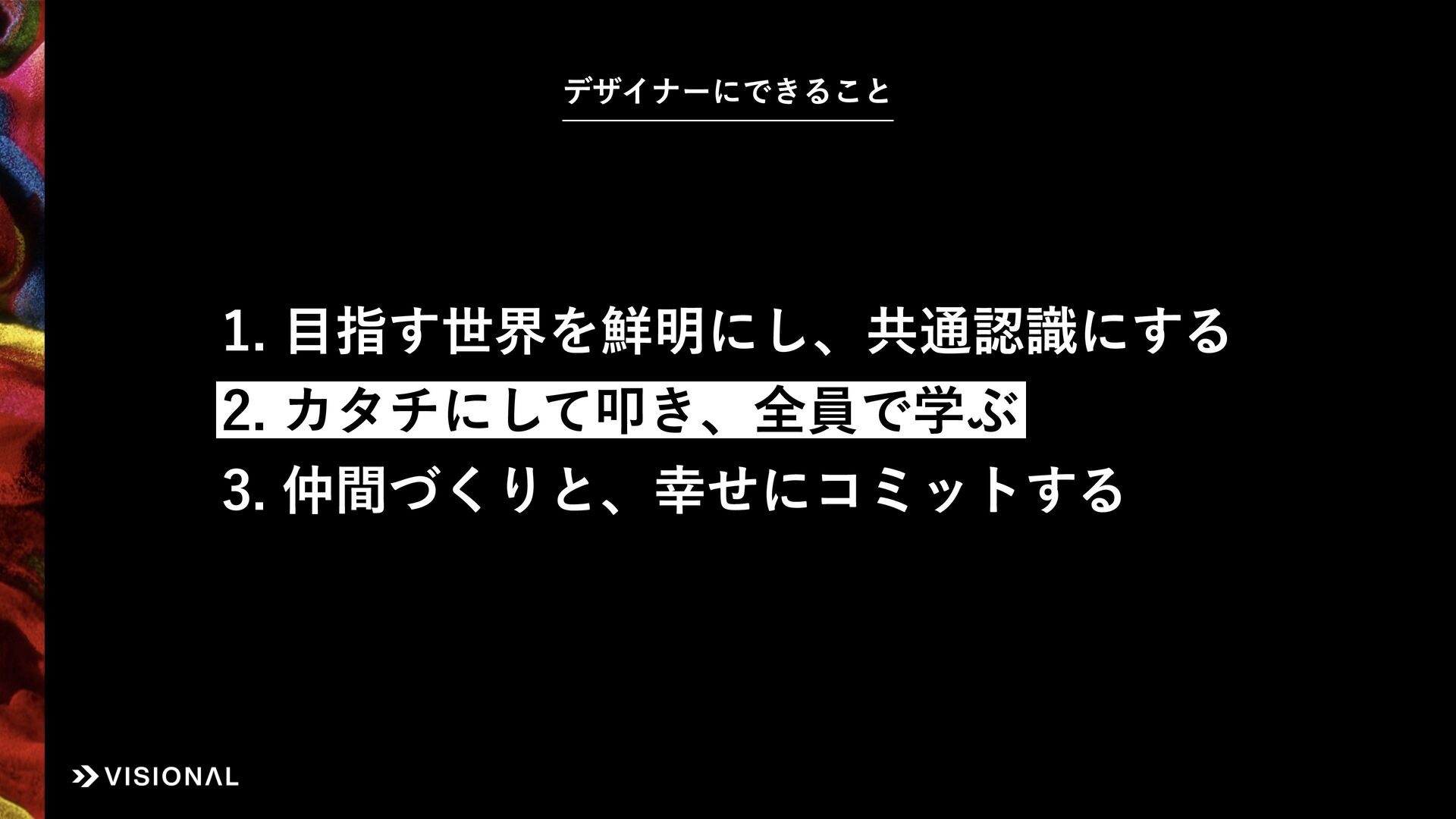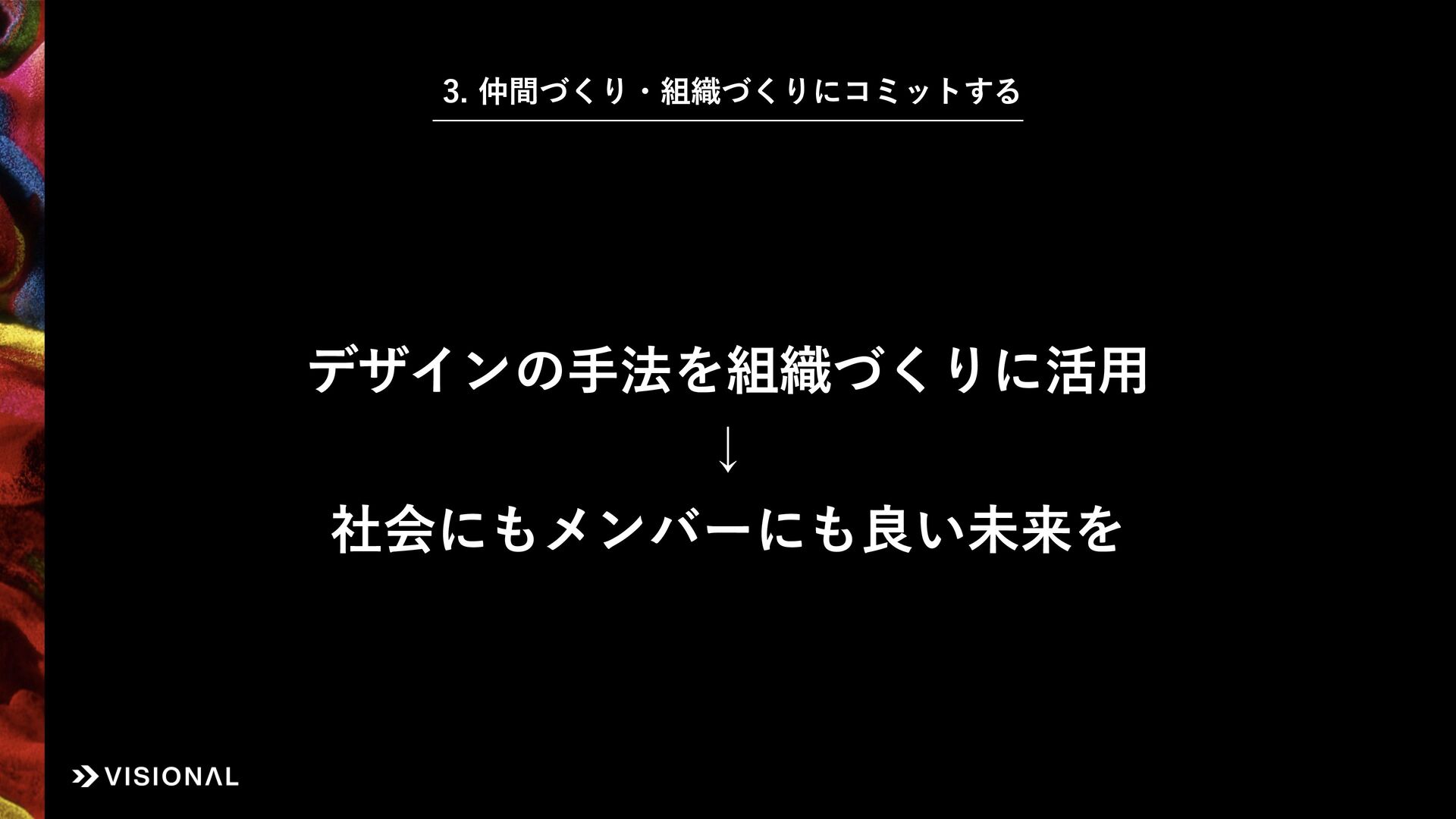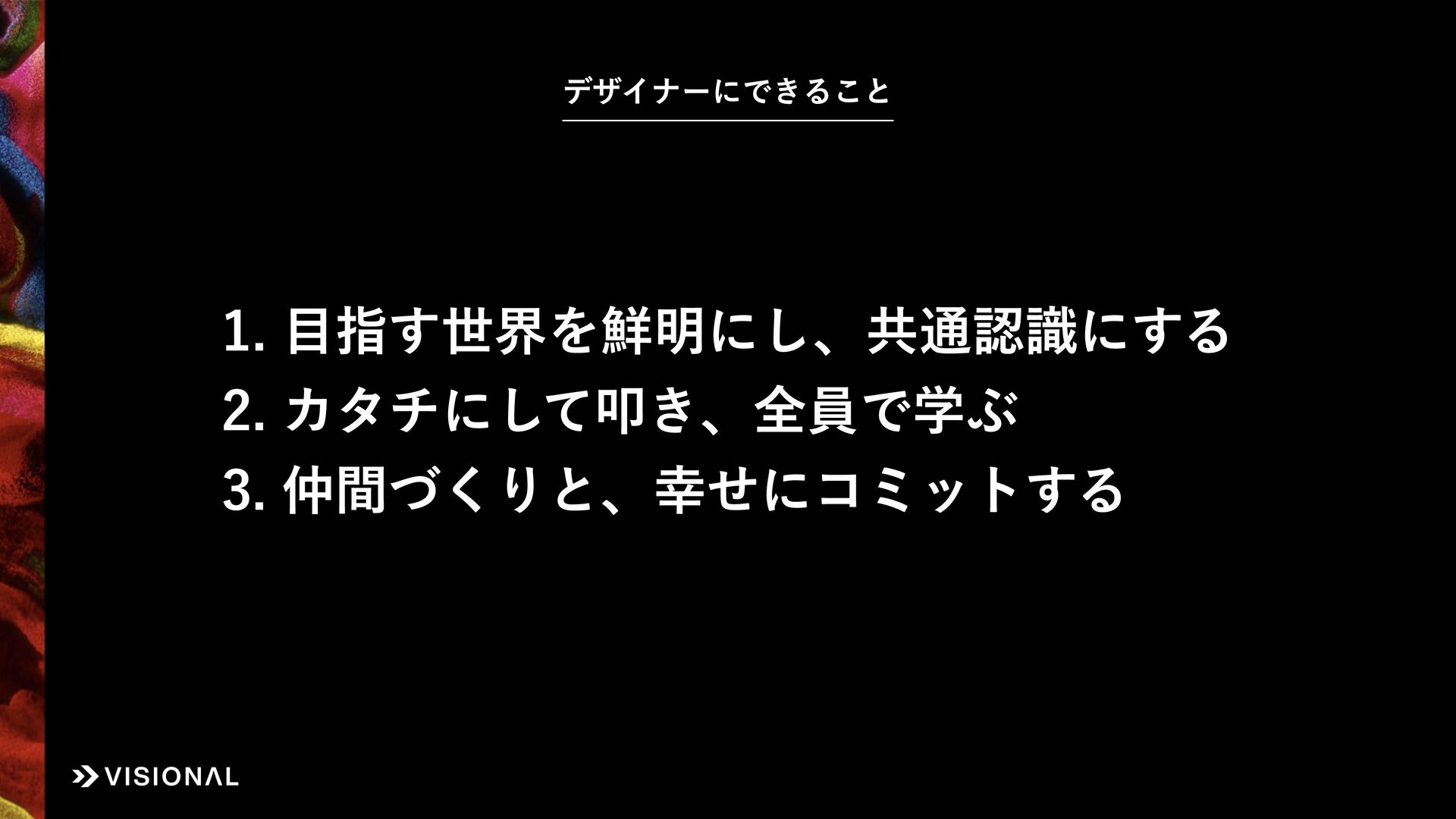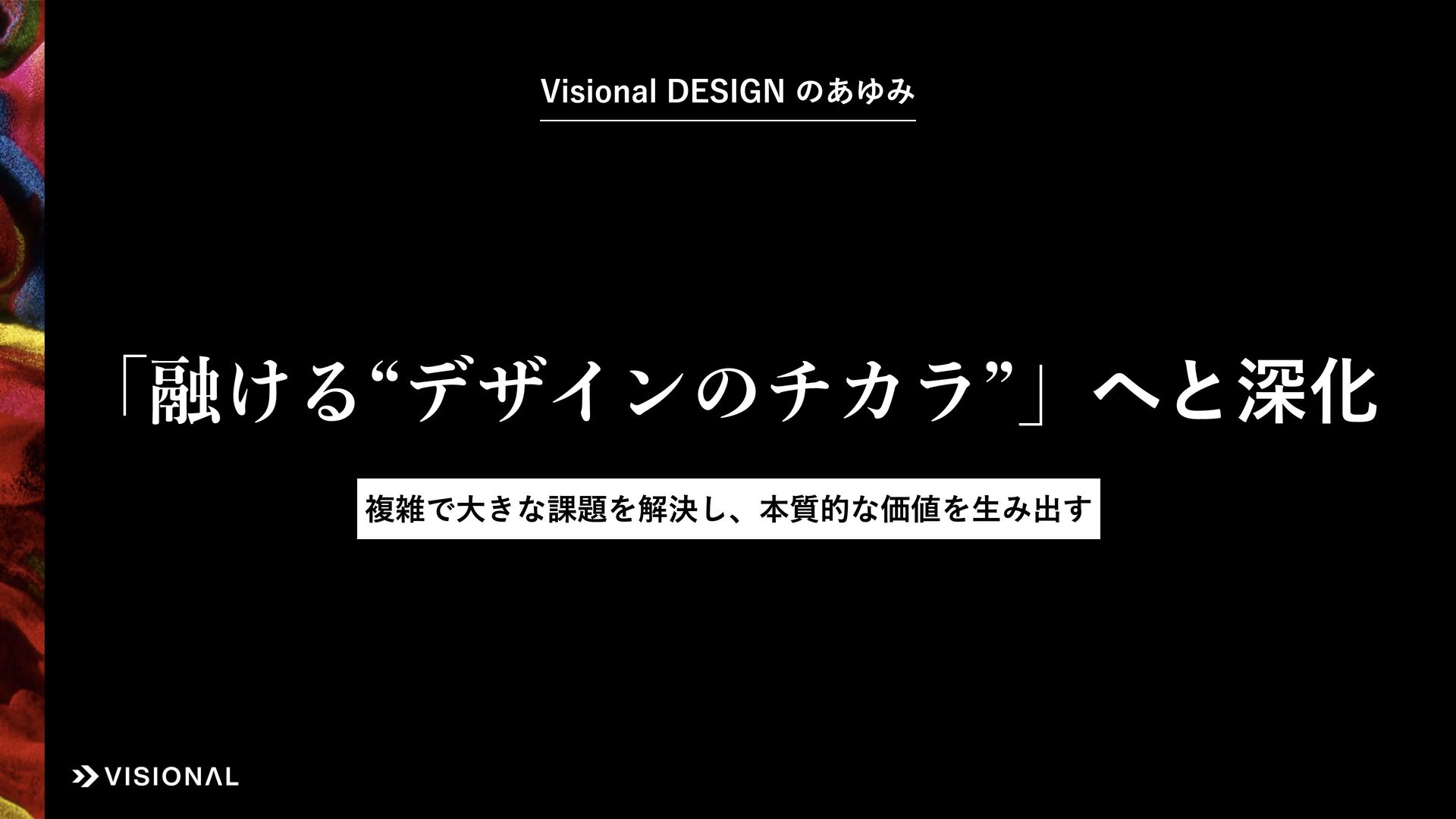 Visionalでは、事業・組織・経営など、あらゆるものに“デザインのチカラ”をはたらかせ、すべての仲間とともに未来のアタリマエとなる価値創出に挑戦しています。