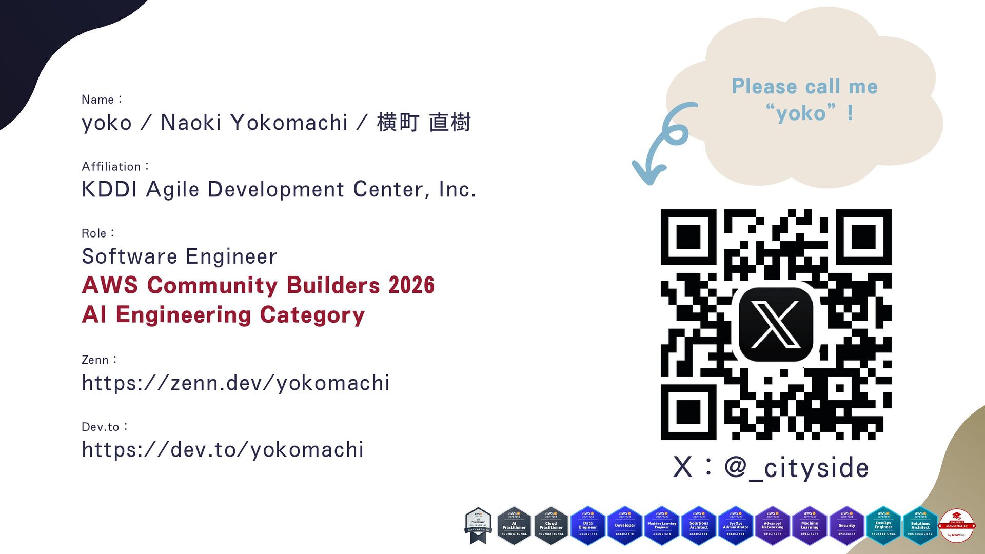 横町 直樹 X:@_cityside Role: Software Engineer AWS Community Builders 2026 AI Engineering Category Affiliation: KDDI Agile Development Center, Inc. Zenn: https://zenn.dev/yokomachi Dev.to: https://dev.to/yokomachi