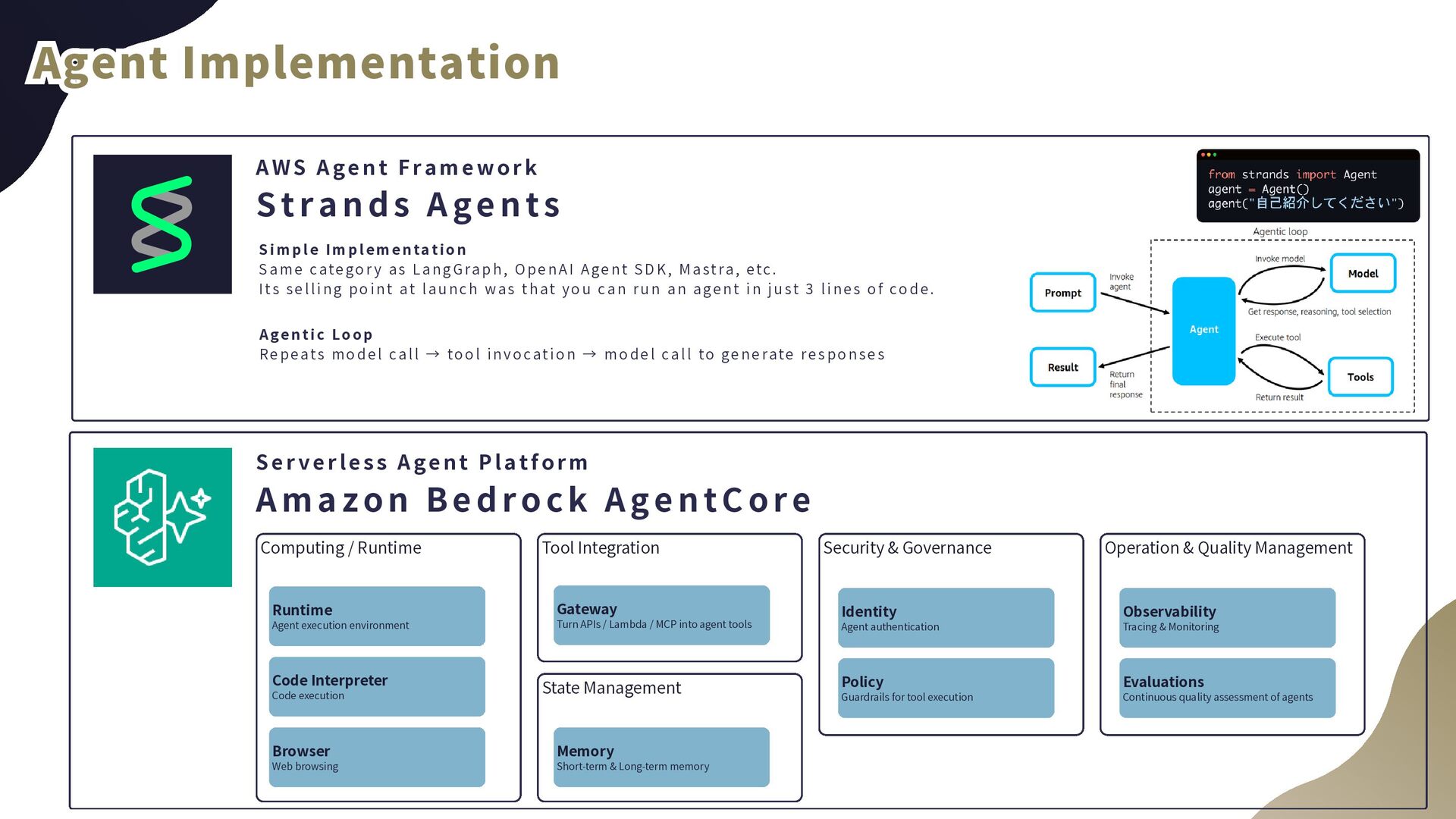 LangGraph, OpenAI Agent SDK, Mastra, etc. I ts sel l i ng poi nt at l aunch was that you can run an agent i n j ust 3 l i nes of code. Agentic Loop Repeats model  cal l  → tool  i nvocati on → model  cal l  to generate responses Runtime Agent executionenvironment AWS Agent Framework Strands Agents Serverless Agent Platform Amazon Bedrock AgentCore AgentImplementation AgentImplementation Agent Implementation Code Interpreter‌ Code execution Browser Web browsing State Management Security &Governance Operation &QualityManagement Gateway Turn APIs/Lambda/MCPintoagenttools Memory Short-term &Long-termmemory Identity Agent authentication Policy Guardrails fortoolexecution Observability Tracing &Monitoring Evaluations Continuous qualityassessmentofagents