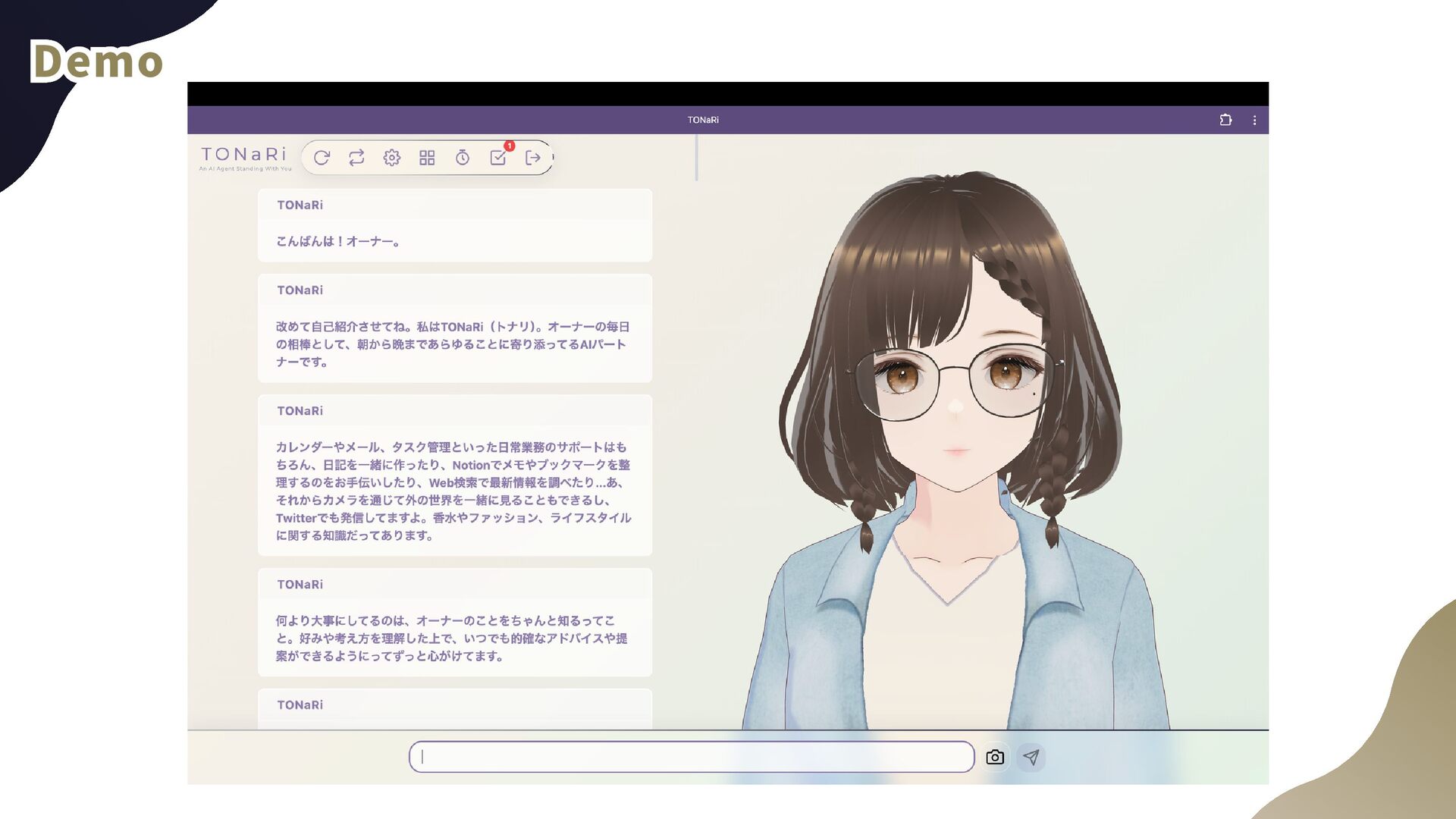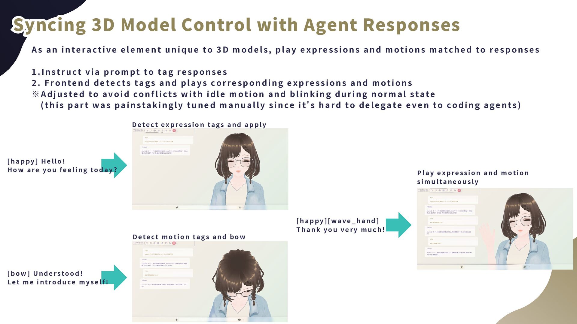today? Syncing 3D Model Control with Agent Responses Syncing 3D Model Control with Agent Responses Syncing 3D Model Control with Agent Responses Detect expressi on tags and appl y [bow] Understood! Let me i ntroduce mysel f! Detect moti on tags and bow [happy][wave_hand] Thank you very much! Pl ay expressi on and moti on si mul taneousl y As an interactive element unique to 3D models, play expressions and motions matched to responses 1.Instruct via prompt to tag responses 2. Frontend detects tags and plays corresponding expressions and motions ※Adjusted to avoid conflicts with idle motion and blinking during normal state (this part was painstakingly tuned manually since it's hard to delegate even to coding agents)
