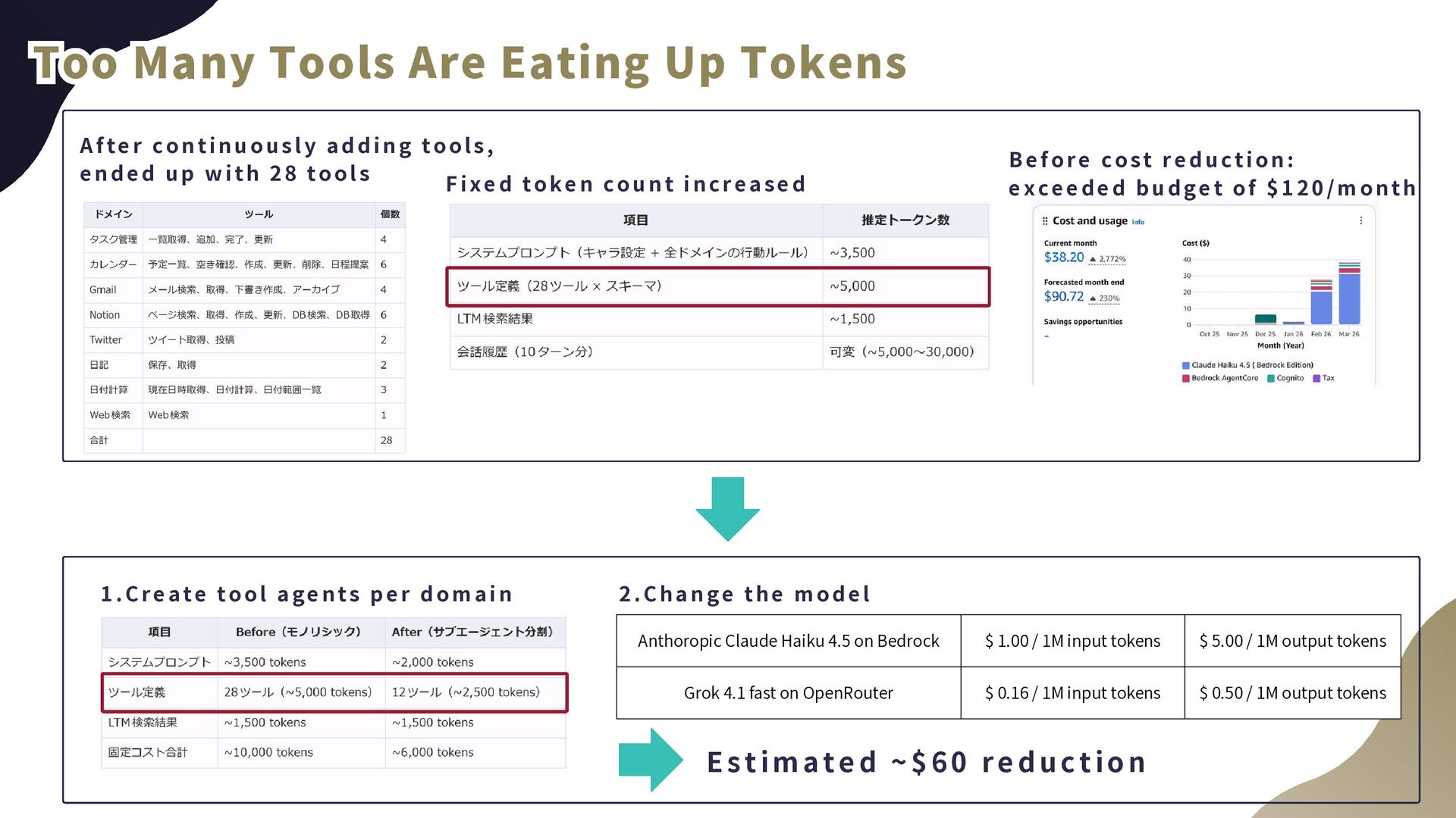 input tokens $ 5.00 / 1M output tokens Grok 4.1 fast on OpenRouter $ 0.16 / 1M input tokens $ 0.50 / 1M output tokens Too Many Tools Are Eating Up Tokens Too Many Tools Are Eating Up Tokens Too Many Tools Are Eating Up Tokens After continuously adding tools, ended up with 28 tools Before cost reduction: exceeded budget of $120/month Fixed token count increased 1.Create tool agents per domain 2.Change the model E s t i m a t e d ~ $ 6 0 r e d u c t i o n