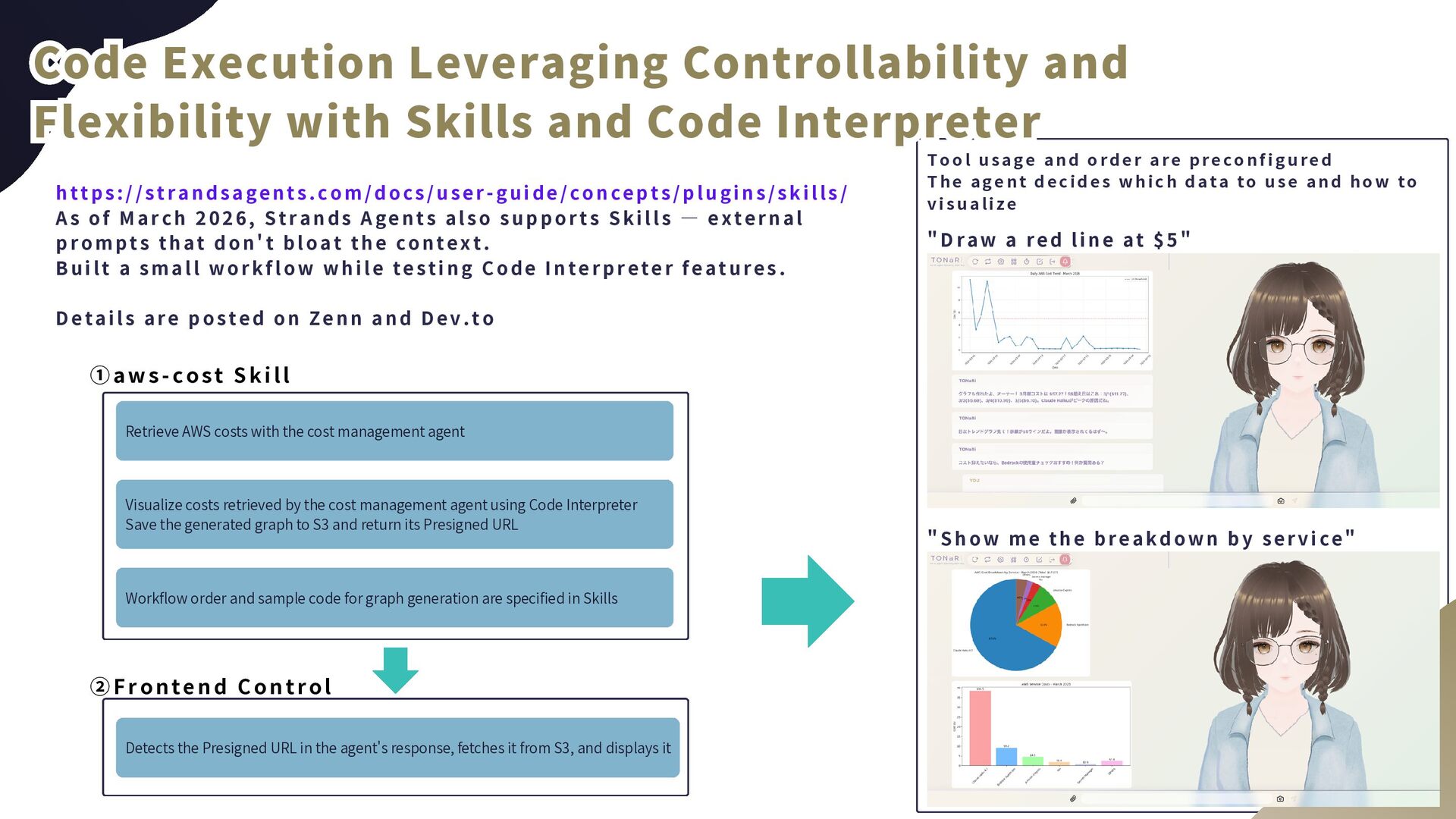 agent using Code Interpreter Save thegeneratedgraphtoS3andreturnitsPresignedURL ‌ Detects thePresignedURLintheagent'sresponse,fetchesitfromS3,anddisplaysit Workflow orderandsamplecodeforgraphgenerationarespecifiedinSkills CodeExecutionLeveragingControllabilityand CodeExecutionLeveragingControllabilityand FlexibilitywithSkillsandCodeInterpreter FlexibilitywithSkillsandCodeInterpreter Code Execution Leveraging Controllability and Flexibility withSkillsandCodeInterpreter h t t p s : / / s t r a n d s a g e n t s . c o m / d o c s / u s e r - g u i d e / c o n c e p t s / p l u g i n s / s k i l l s / A s o f M a r c h 2 0 2 6 , S t r a n d s A g e n t s a l s o s u p p o r t s S k i l l s — e x t e r n a l p r o m p t s t h a t d o n ' t b l o a t t h e c o n t e x t . B u i l t a  s m a l l  w o r k f l o w  w h i l e  t e s t i n g  C o d e  I n t e r p r e t e r  f e a t u r e s . D e t a i l s a r e  p o s t e d  o n  Z e n n  a n d  D e v . t o ①aws-cost Skill ②Frontend Control " D r a w a  r e d  l i n e  a t  $ 5 " " S h o w m e  t h e  b r e a k d o w n  b y  s e r v i c e " Tool usage and order are preconfigured The agent decides which data to use and how to visualize