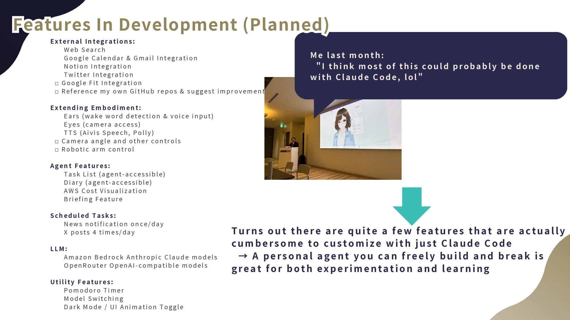 Integration ☑ Notion Integration ☑ Twitter Integration ☐ Google Fit Integration ☐ Reference my own GitHub repos & suggest improvements to myself Extending Embodiment: ☑ Ears (wake word detection & voice input) ☑ Eyes (camera access) ☑ TTS (Aivis Speech, Polly) ☐ Camera angle and other controls ☐ Robotic arm control Agent Features: ☑ Task List (agent-accessible) ☑ Diary (agent-accessible) ☑ AWS Cost Visualization ☑ Briefing Feature Scheduled Tasks: ☑ News notification once/day ☑ X posts 4 times/day LLM: ☑ Amazon Bedrock Anthropic Claude models ☑ OpenRouter OpenAI-compatible models Utility Features: ☑ Pomodoro Timer ☑ Model Switching ☑ Dark Mode / UI Animation Toggle Features In Development (Planned) Features In Development (Planned) Features In Development (Planned) 🤔 Turns out there are quite a few features that are actually cumbersome to customize with just Claude Code → A personal agent you can freely build and break is great for both experimentation and learning M e l a s t m o n t h : " I t h i n k m o s t o f t h i s c o u l d p r o b a b l y b e d o n e w i t h C l a u d e C o d e , l o l "