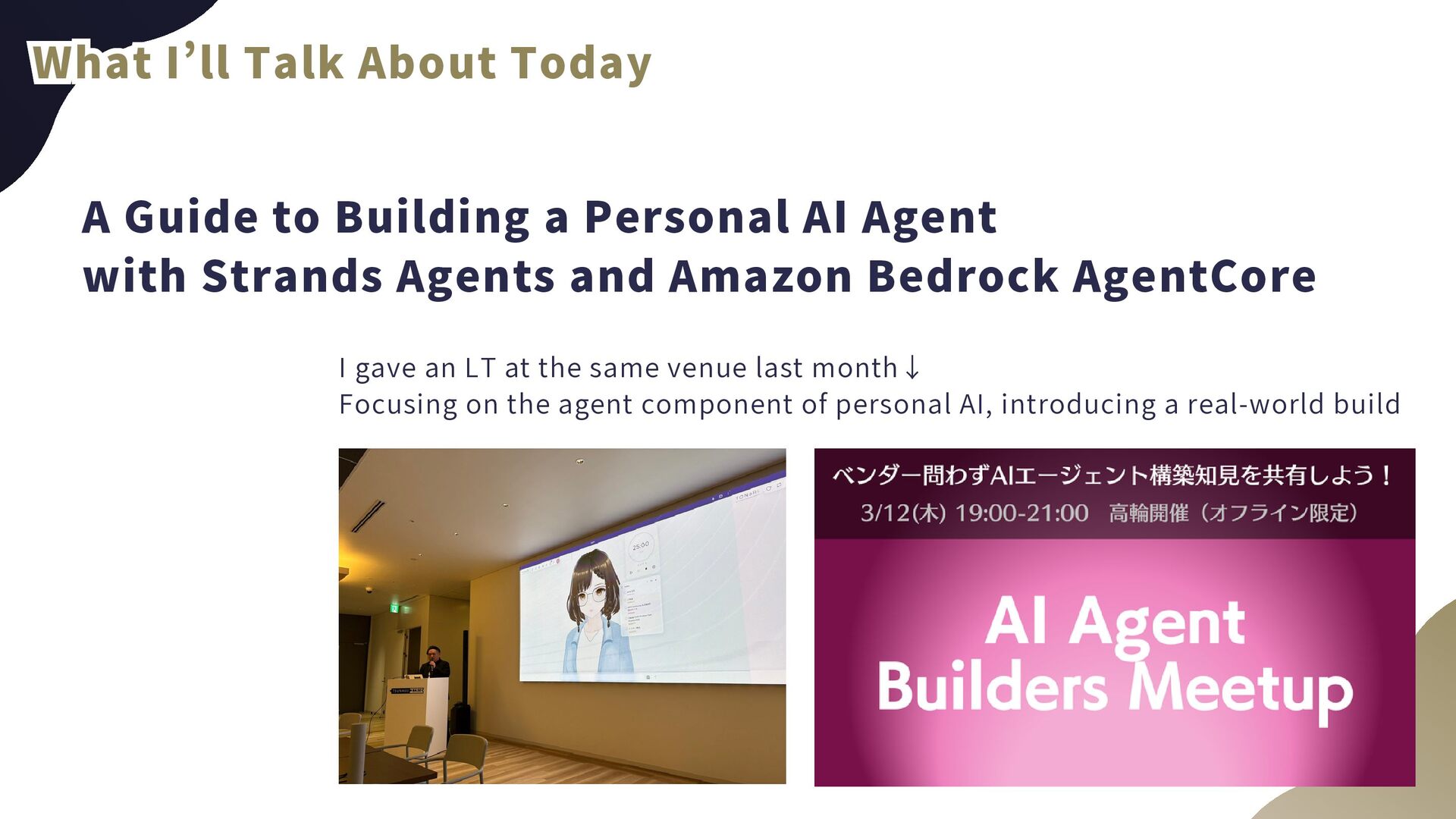 What I’ll Talk About Today A Guide to Building a Personal AI Agent with Strands Agents and Amazon Bedrock AgentCore I gave an LT at the same venue last month↓ Focusing on the agent component of personal AI, introducing a real-world build