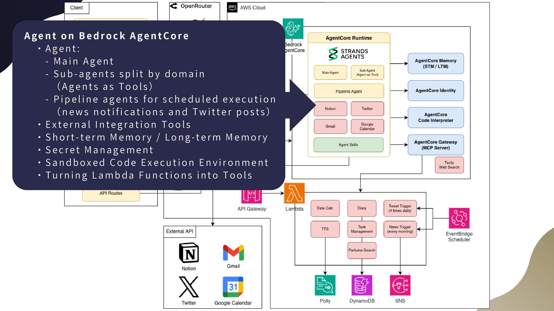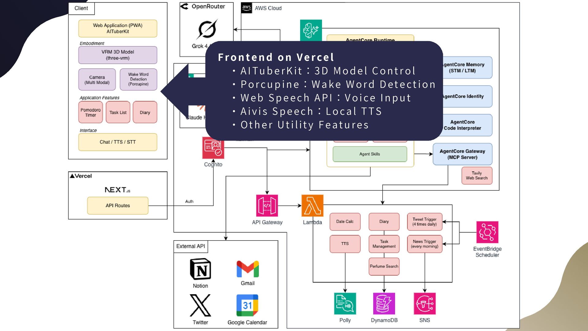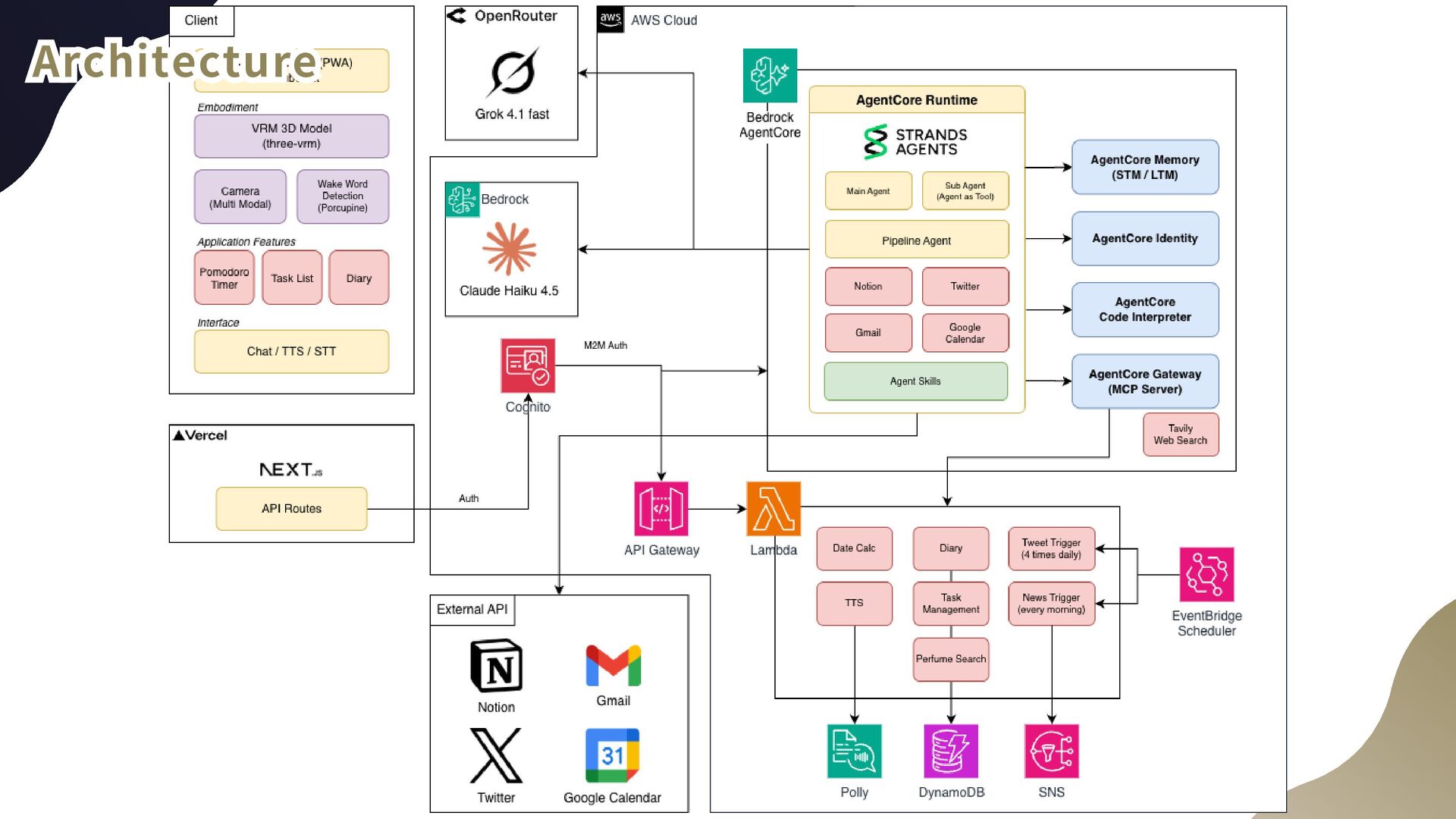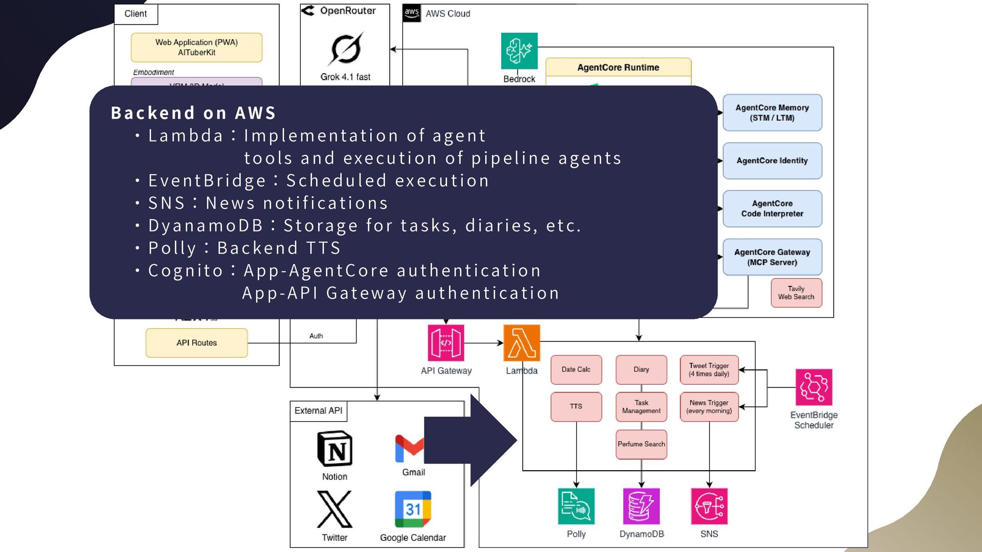 WS     ・ L a m b d a : I m p le m e n tati o n o f age n t to o l s a n d exe c u t i o n o f p i p el i n e a ge n ts     ・ E v e n t B r i d g e : S c h e d u l e d e xe c u t i o n     ・ S N S : N e w s n o t i f ic a t io n s     ・ D y a n a m o D B : S t o r ag e fo r t a sk s , di a ri es , e tc .     ・ P o l l y : B a c k e n d T T S     ・ C o g n i t o : A p p - A g e n t C o re a u t h en t i c a ti o n                 A p p - A P I G a t e wa y a u t he n t i c at i o n