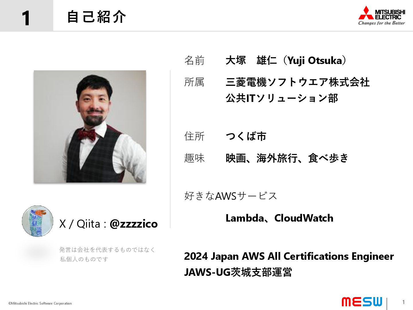 私個人のものです 自己紹介 1 1 名前 大塚 雄仁(Yuji Otsuka) 所属 三菱電機ソフトウエア株式会社 公共ITソリューション部 住所 つくば市 趣味 映画、海外旅行、食べ歩き 好きなAWSサービス Lambda、CloudWatch 2024 Japan AWS All Certifications Engineer JAWS-UG茨城支部運営