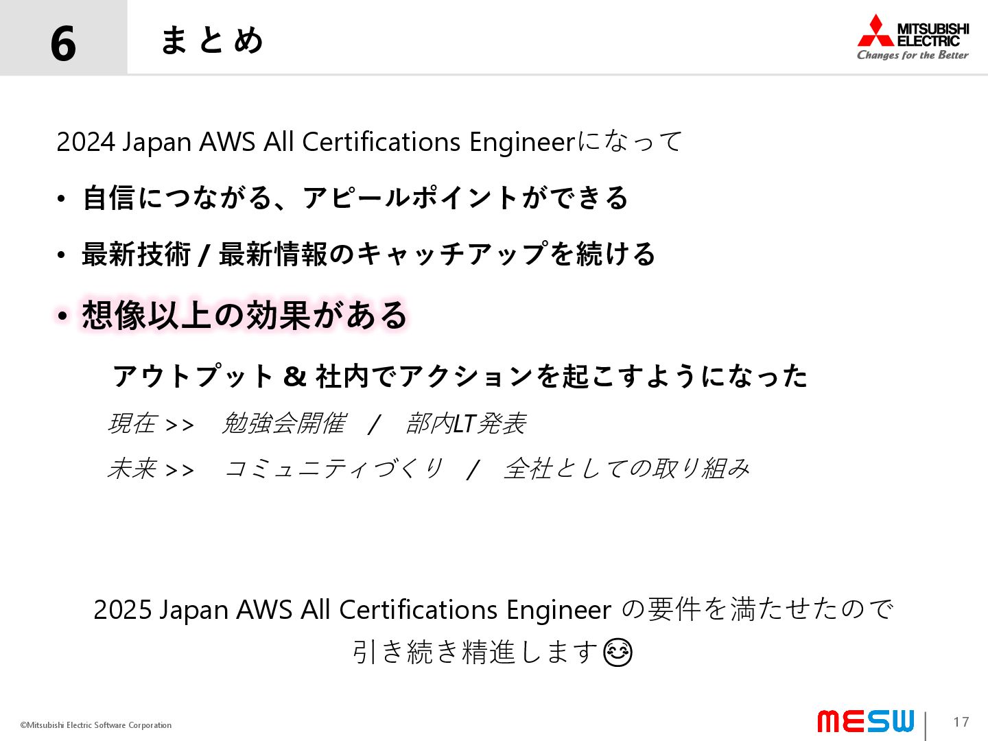 All Certifications Engineerになって • 自信につながる、アピールポイントができる • 最新技術 / 最新情報のキャッチアップを続ける • 想像以上の効果がある アウトプット & 社内でアクションを起こすようになった 現在 >> 勉強会開催 / 部内LT発表 未来 >> コミュニティづくり / 全社としての取り組み 2025 Japan AWS All Certifications Engineer の要件を満たせたので 引き続き精進します☺